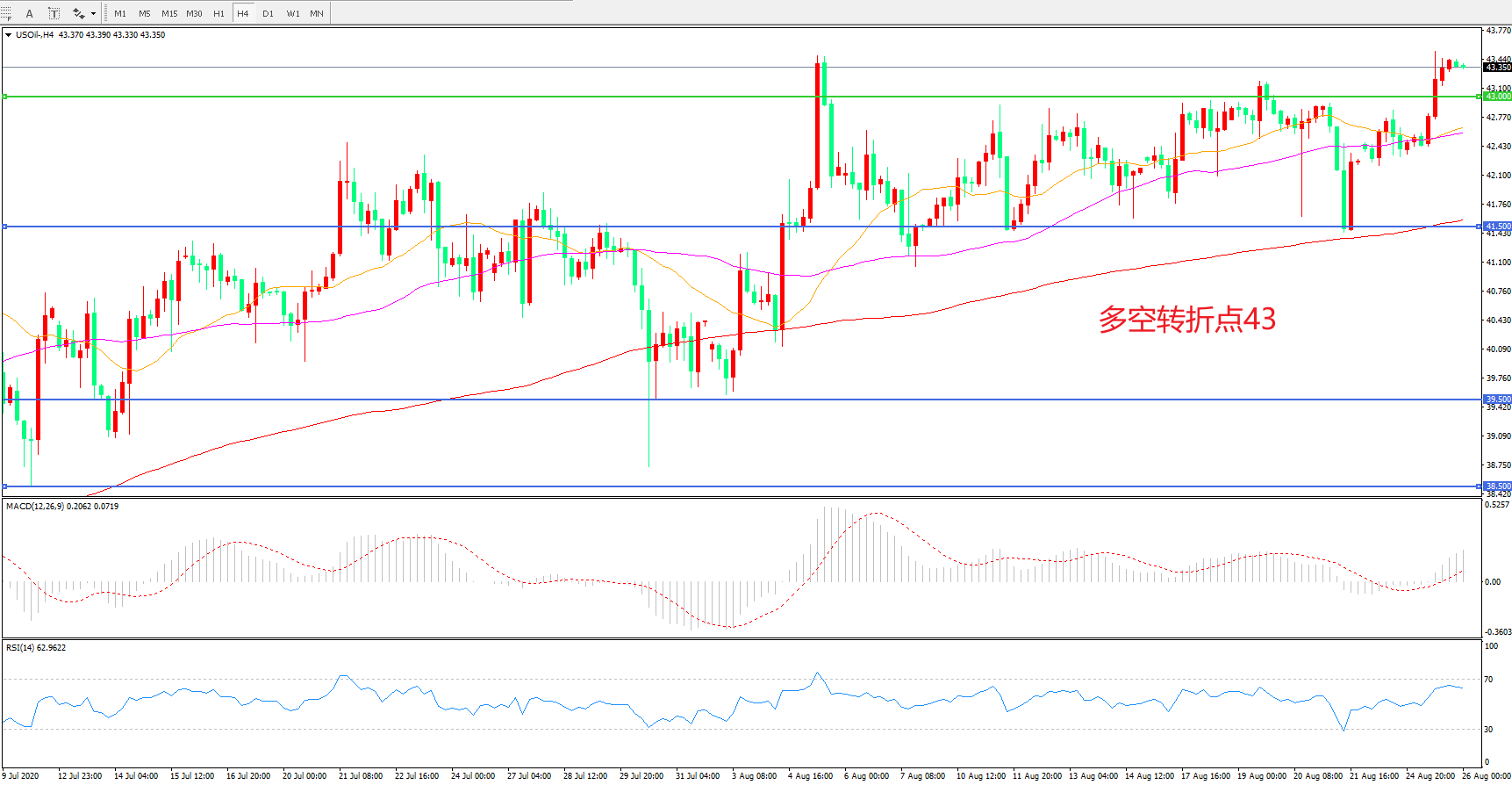4小时图看,油价阳线连续拉升,整体表现偏强,短期均线系统有拐头迹象,MACD红柱增加,RSI指标走平,日内延续上行概率较大。