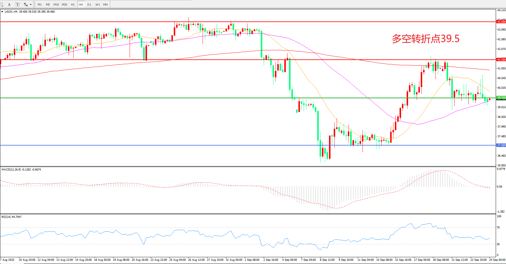 4小时图看,油价以39.5美元为依托延续震荡,整体波幅较小,均线系统走平,MACD红柱减少,RSI指标走平,日内延续震荡概率较大。