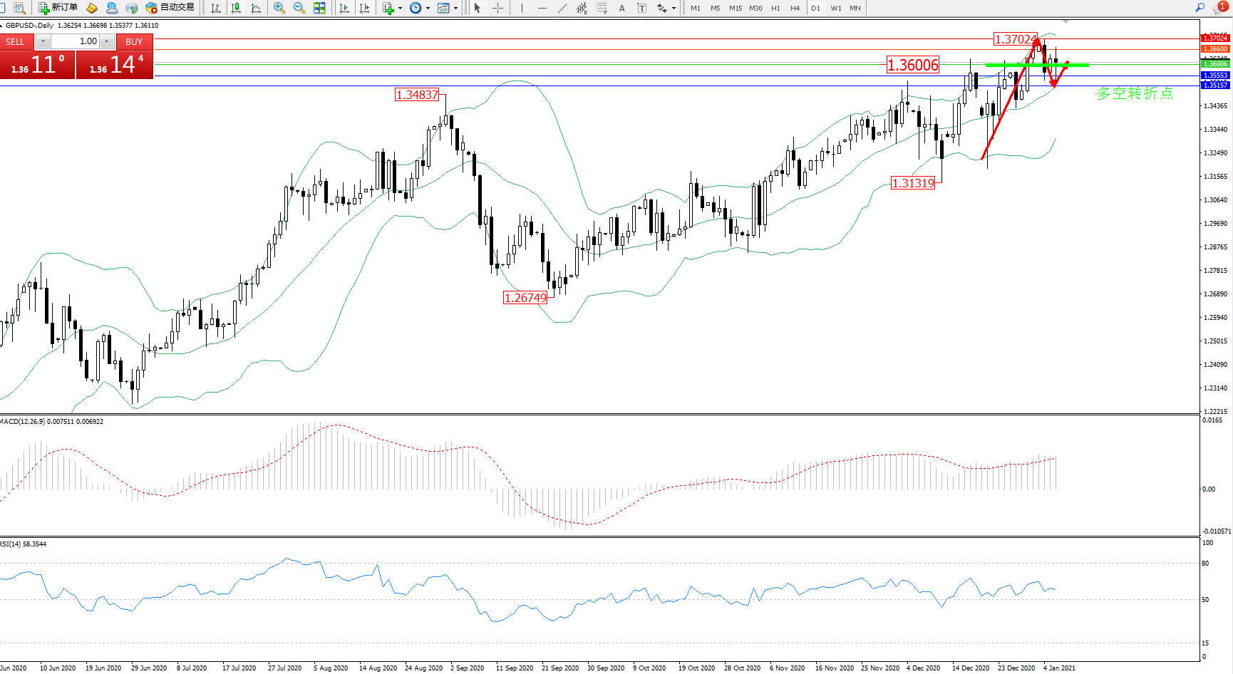交易策略:1.36006上方看涨,目标1.36600、1.37024