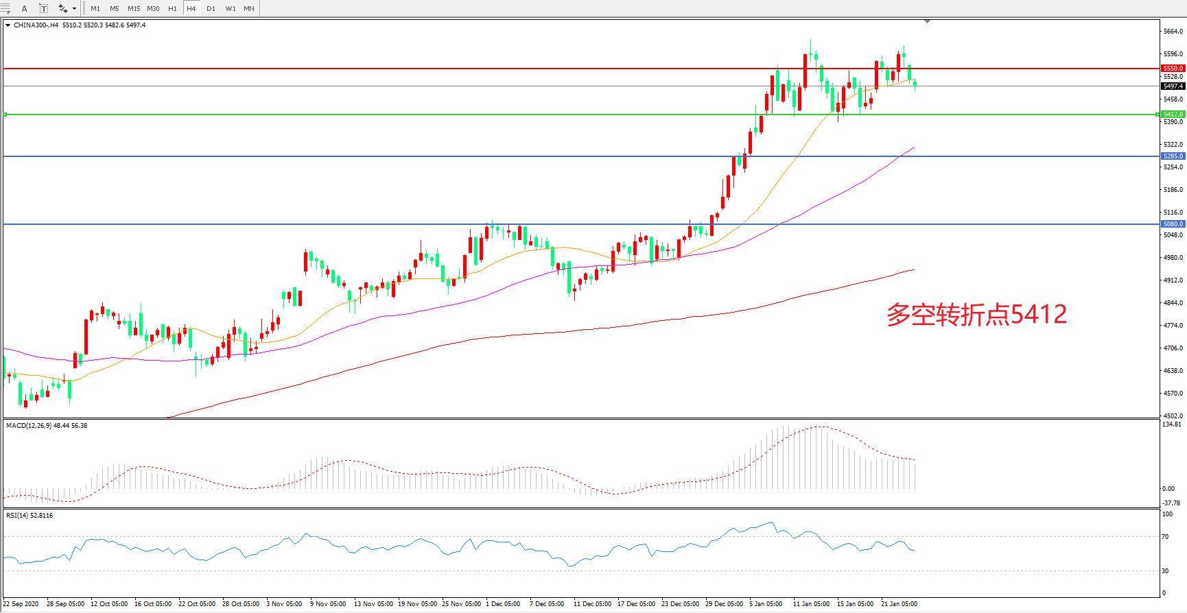 4小时图看,沪深300延续高位震荡走势,短期走势陷入震荡,5412成为下方支撑,5550成为上方阻力,均线系统逐渐走平,MACD红柱缩短,RSI指标走平,日内延续震荡概率较大。