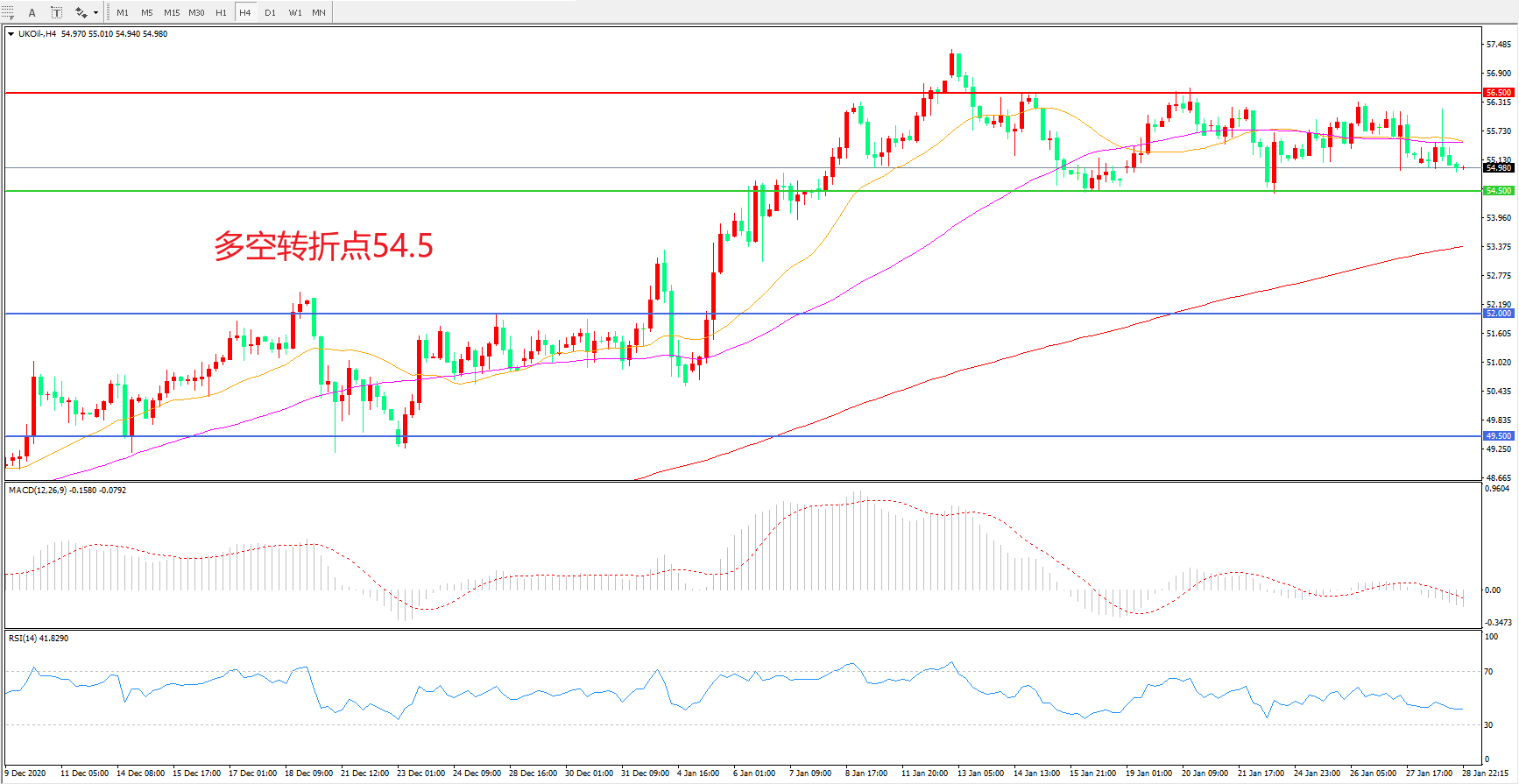 交易策略:  在54.50之上看涨,目标56.50    60.00