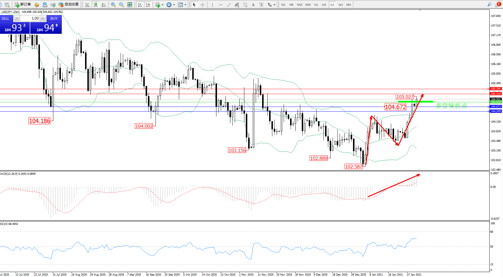 美元兑日圆底部持续拉升上扬至104.913位置震荡,日本1月工厂活动重回跌势,新冠疫情反弹以及多地实施紧急状态影响到经营环境。数据显示制造商1月产出再度下滑,与日本政府周五公布更为乐观的预测大相径庭。日本政府称,制造业者预期1月产出大幅反弹。企业将产出下降归因于日本首相菅义伟上个月宣布的紧急状态下实施的限制措施。紧急状态覆盖了东京和其他地区,占日本人口的55%。尽管12月总体稳定,但1月的下降意味着该行业自2019年4月以来未曾增长,造商表示,在最近的调查期内产出水平再次出现下降。此外,随着1月份人员编制的减少,企业更不愿意补充业内自愿离职者留下的空缺。受到与COVID-19相关的供应链中断影响,供应商的交货时间和新出口订单等其他指标分别创下七个月和四个月以来最快降速。
