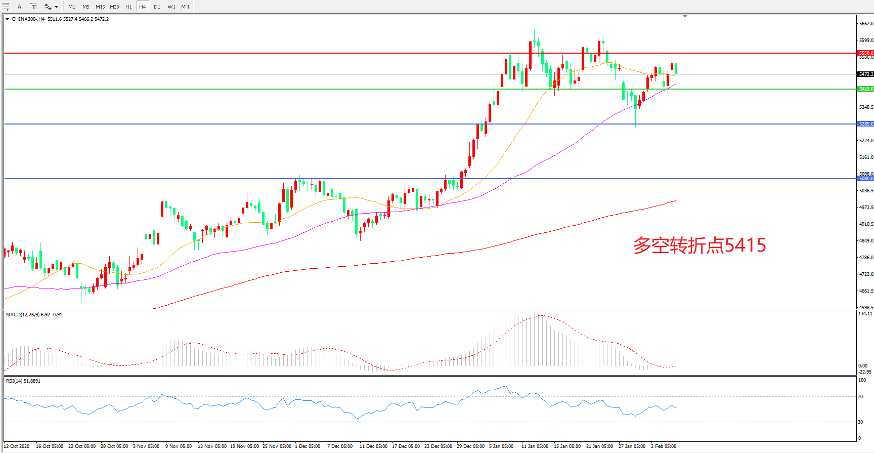4小时图看,沪深300回踩55周期均线后震荡反弹,区间震荡迹象明显,5415成为下方支撑,5550成为上方阻力,MACD红柱增加,RSI指标走平,日内延续震荡概率较大。