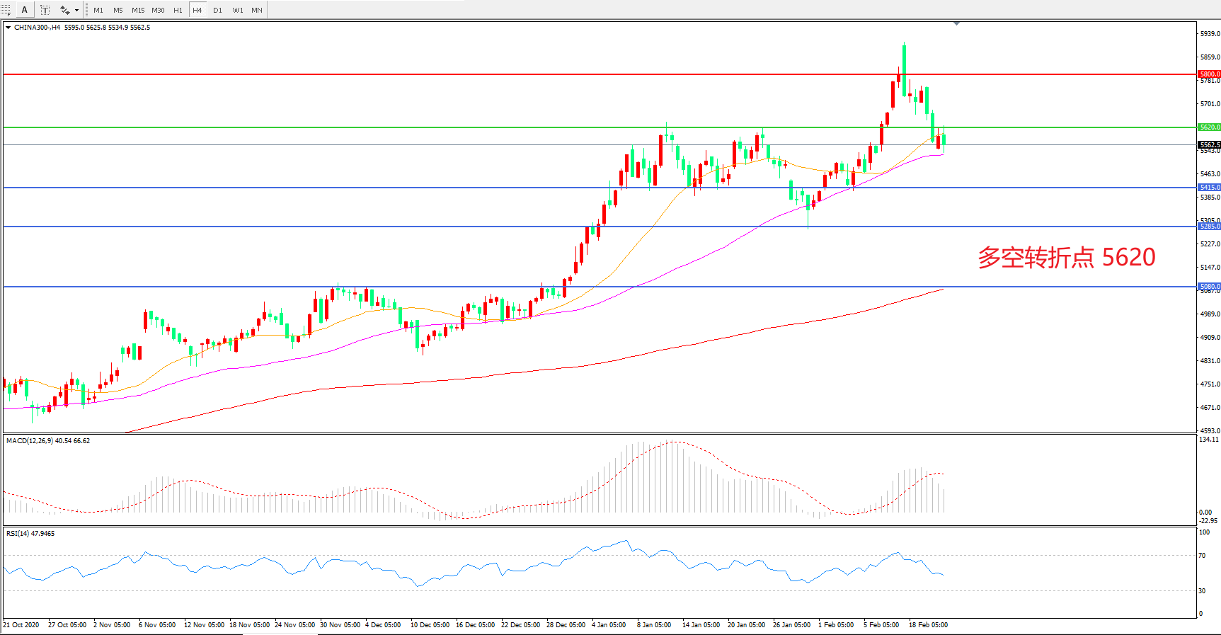 4小时图看,沪深300延续冲高回落,短期陷入窄幅整理形态 ,5620成为短期阻力,55均线成为下方支撑,MACD红柱缩短,RSI指标向下,日内延续震荡概率较大。