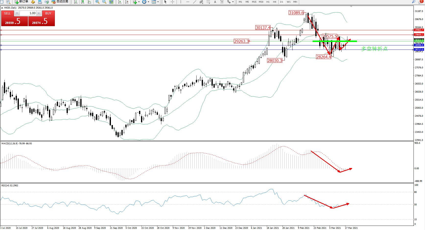 技术点评:高位空头动力持续震荡下移后,低位抵达布林带指标下轨28264附近得到支撑开始反转震荡上移,触及布林带指标中轨附近节点后有进一步向上移动态势,布林带指标呈收口走势持续中,关注中轨附近节点,MACD指标处于0轴线下侧弱势整理后有上移迹象,RSI指标处于50均衡线附近弱势徘徊中;
