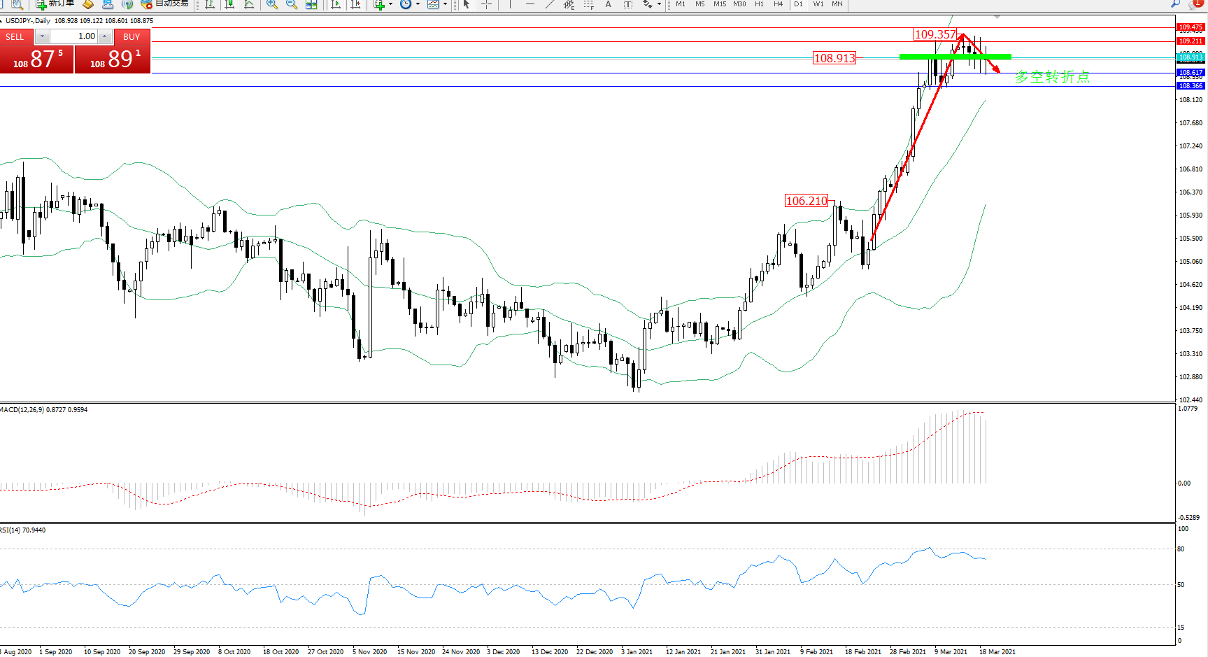 技术点评:多头动力延续布林带指标上轨附近持续震荡上扬,高位抵达109.357附近节点后遇阻开始维持宽幅震荡回撤,高位短期或将维持震荡走势,布林带指标呈收口走势持续中,MACD指标处于多头区域高位整理平移中,RSI指标处于多头区域高位80均衡线下方弱势徘徊有下移迹象;