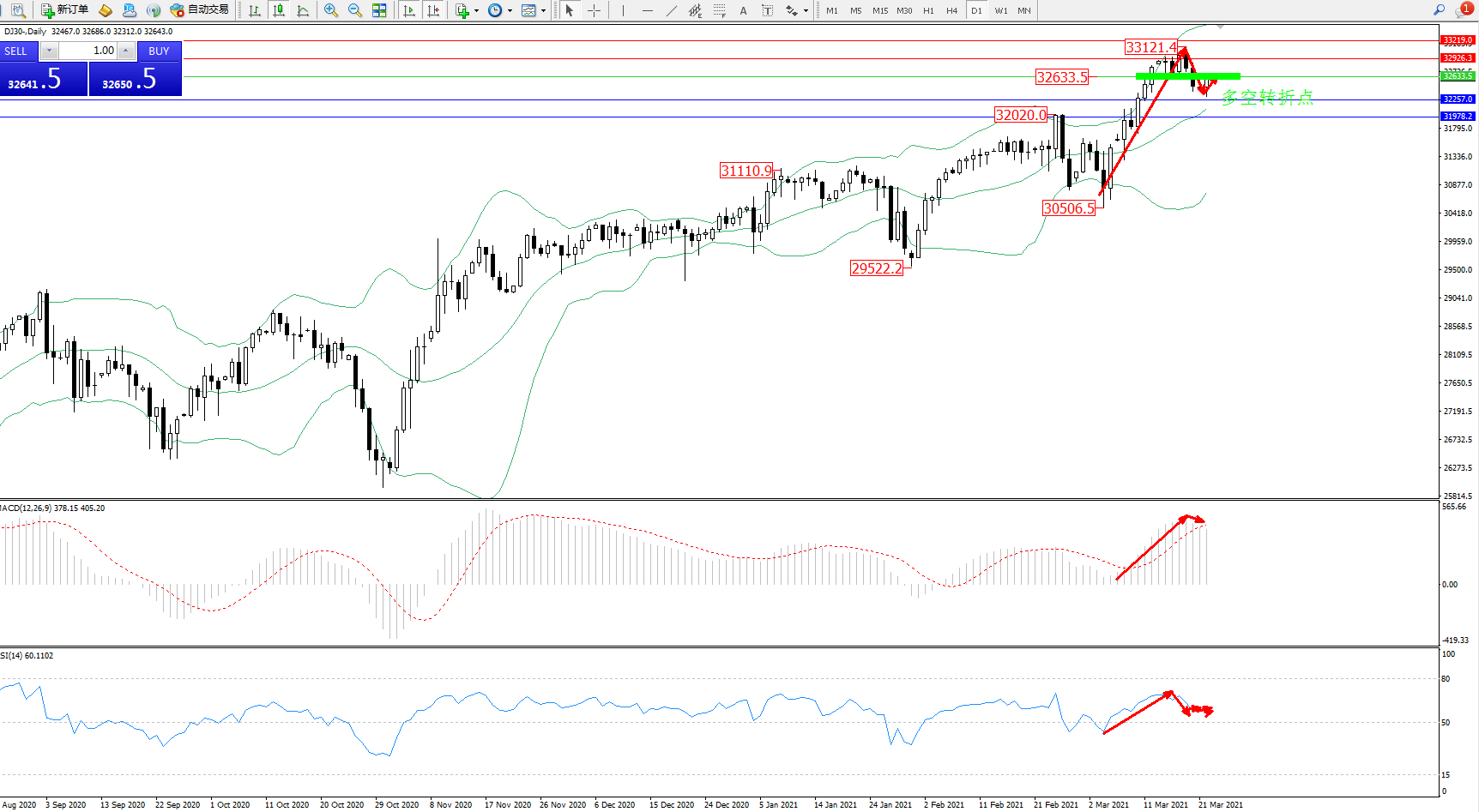 技术点评:多头动力延续布林带指标通道上轨附近持续震荡上扬,高位抵达33121位置后震荡回撤,短期或维持短暂下行走势,布林带指标呈张口走势后开始有收口迹象,MACD指标多头动力持续震荡上扬后高位整理有回撤迹象,RSI指标处于多头区域整理后开始反转向下移动后平移;