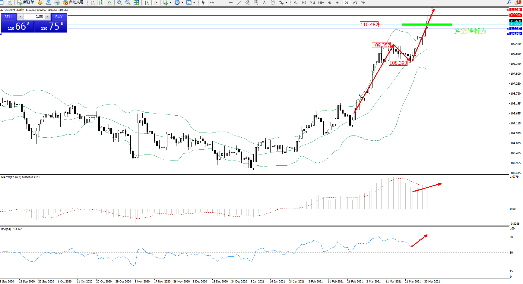 美元对日圆高位拉升至110.668附近震荡,商品货币波动不大。日元容易受到美国通胀预期高于日本以及美国长期国债收益率上升的影响。美元兑日元通常与美国长期国债收益率走势正相关。美元兑日元或迎六连涨,再刷一年新高。日本央行降低4月份债券购买频率。将在4月购买1500亿日元小于1年的日本国债债券,频率为每月一次。4月将首次购买2000亿日元10-25年期日本国债。4月将首次发行500亿日元大于25年期的日本国债。