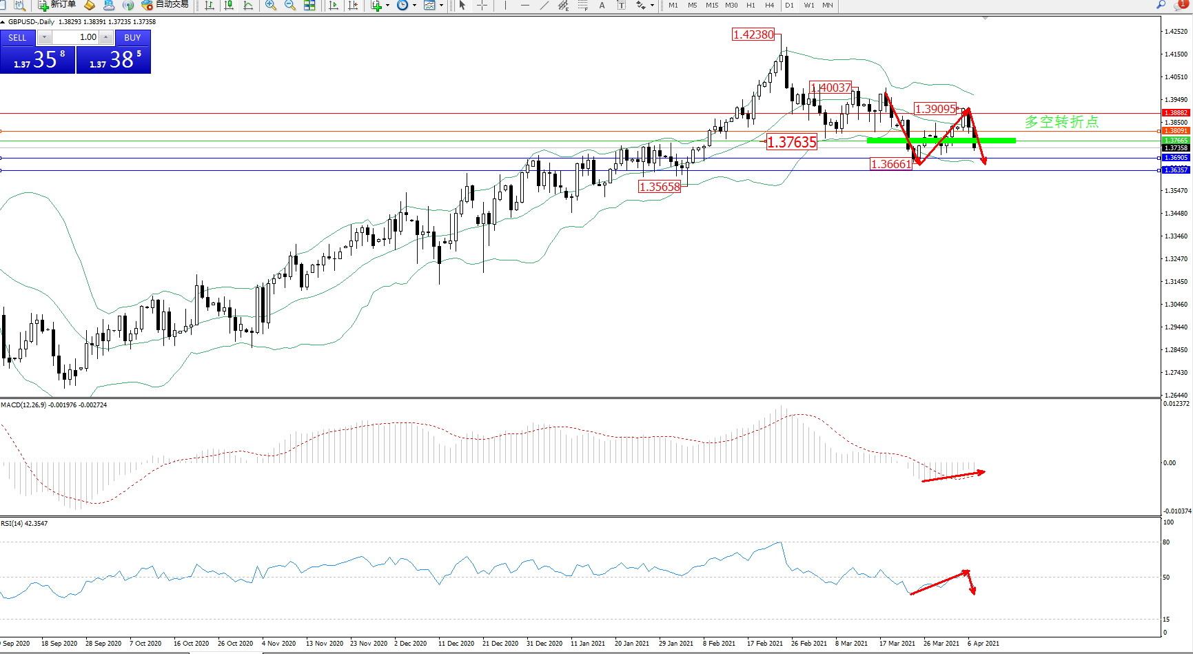 交易策略:1.37635下方看跌,目标1.36905、1.36357