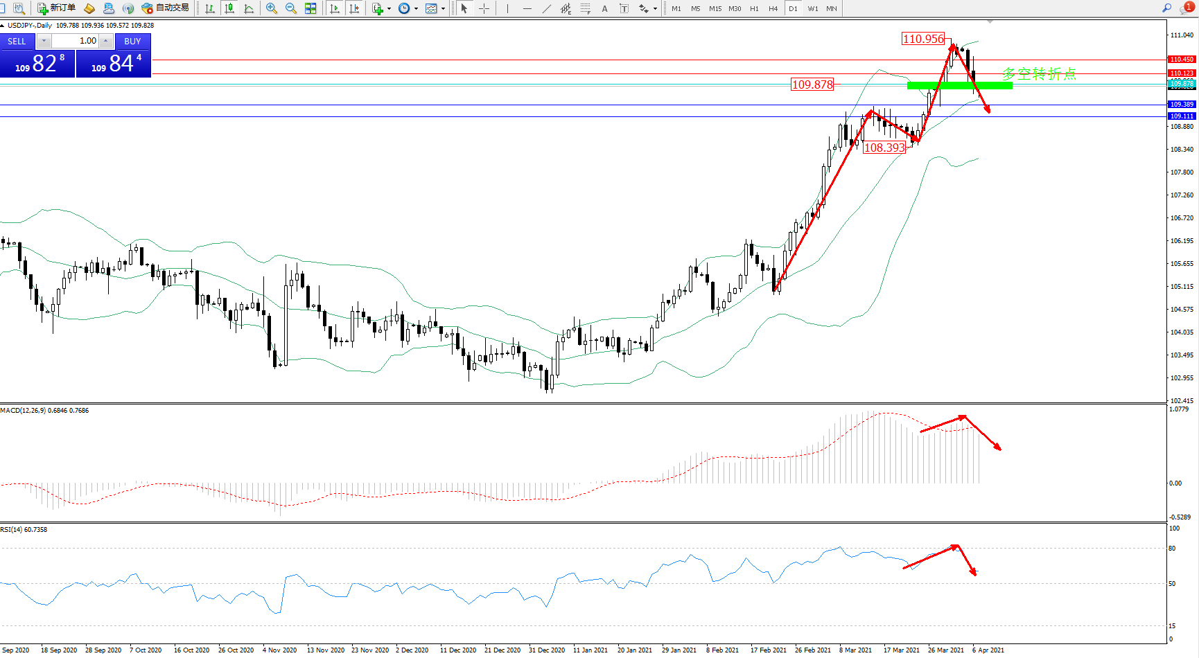 技术点评:多头动力延续布林带指标通道中上轨区间持续震荡上扬,高位抵达110.956位置后遇阻回撤,触及中轨附近节点后得到短暂支撑,空头动力有继续向下移动迹象,布林带指标呈张口走势后开始有收口迹象,MACD指标处于多头区域维持震荡后有回撤下行迹象,RSI指标处于多头区域高位震荡后继续下行中;