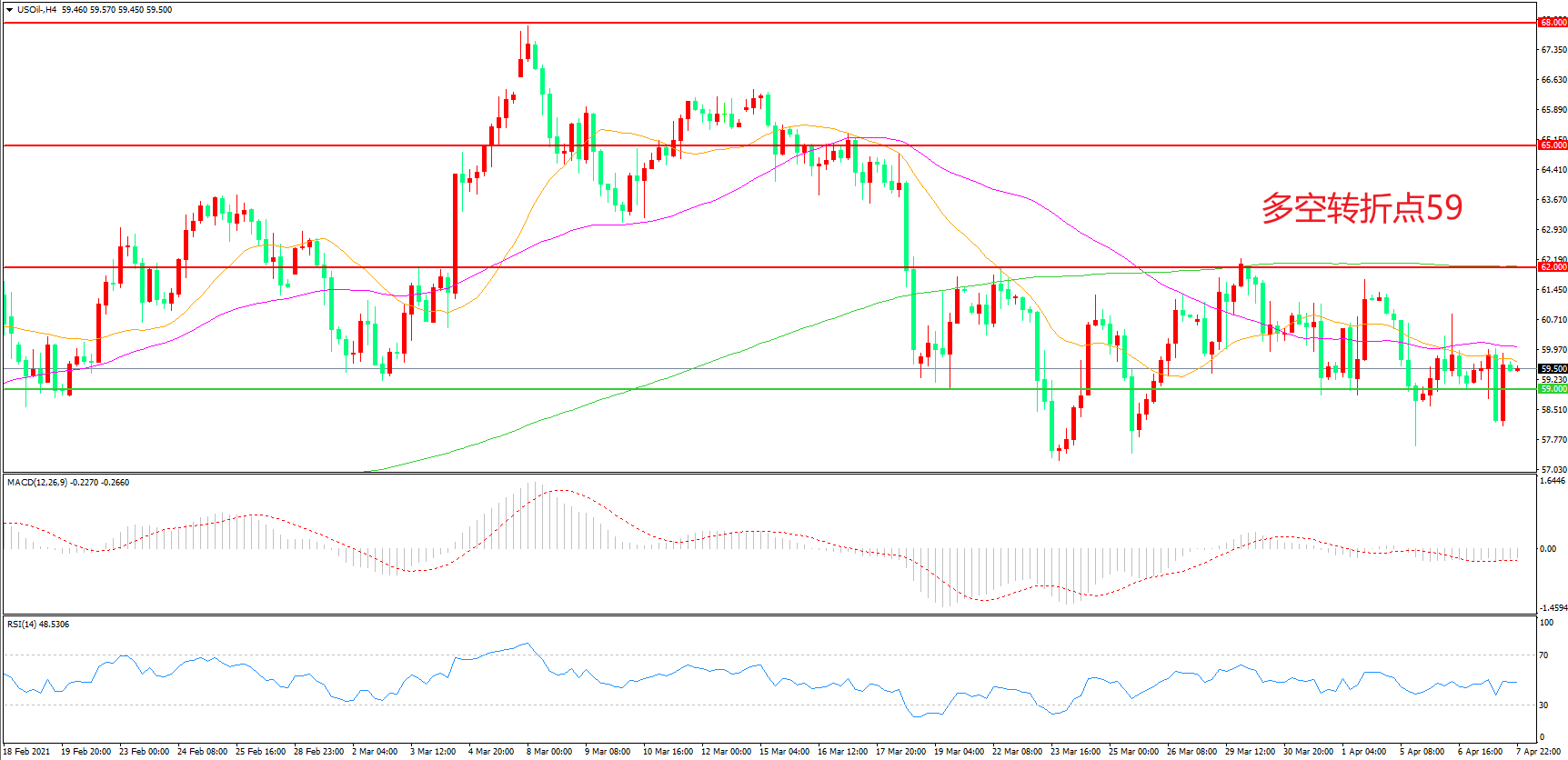 周三(4月7日),根据美国能源信息署公布的数据显示,当周EIA原油库存降幅减少352.20万桶,超过市场预期,但精炼油、汽油库存的增加引发了市场担忧,美油日内跌幅达一度高达2%,但由于全球复苏前景继续向好,投资者仍然看多油价未来前景,美国WTI原油震荡回升,收报59.50美元/桶。
