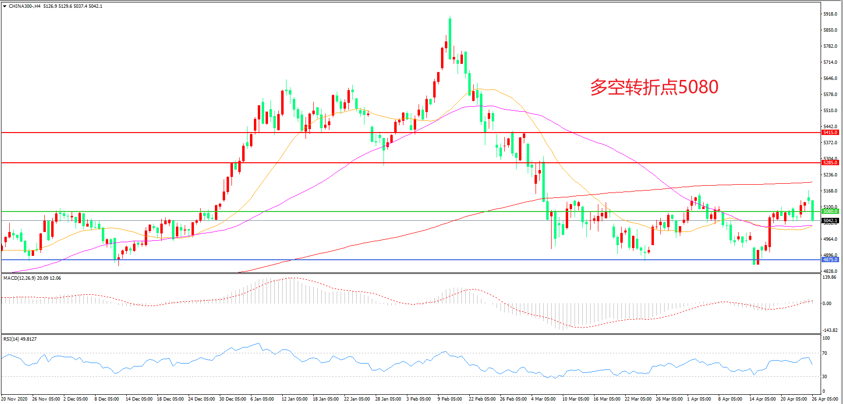 4小时图看,沪深300小幅冲高后长阴回落,上行趋势遭到破坏,但均线系统粘合形成的下方支撑依然稳固,200周期均线成为上方阻力,MACD红柱增加,RSI指标走平,日内震荡上行概率较大。
