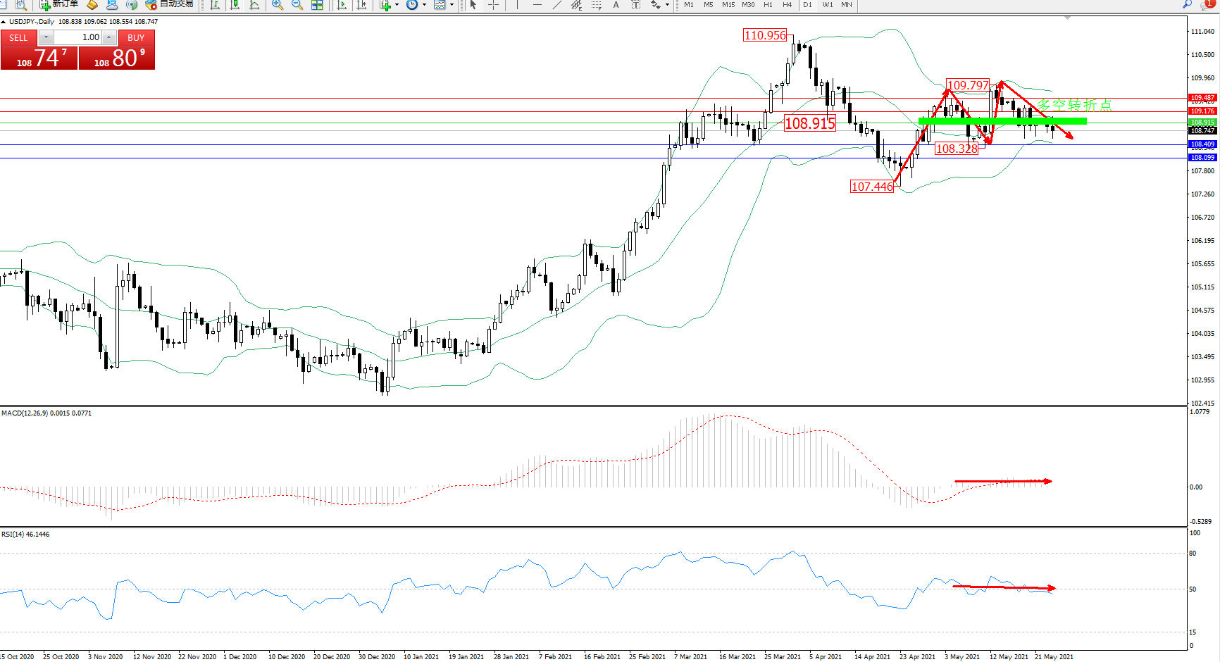 技术点评:低位多头动力持续震荡上扬,高位抵达布林带指标上轨附近109.797节点后遇阻回撤,维持在中轨下方继续窄幅震荡中,短期或有继续弱势平缓下移迹象,布林带指标呈缓慢收口走势平移后有继续徘徊迹象,MACD指标处于0轴线附近弱势徘徊中,RSI指标处于50均衡线附近维持窄幅震荡;