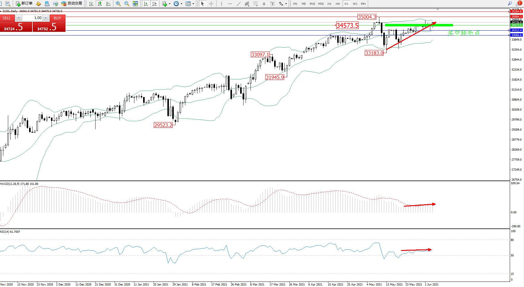 道琼斯指数6月4日(周五)收盘上涨180.40点,涨幅0.52%,报34757.44点;美国股市逼近历史高位,上月非农就业人数的加速增长提振了市场对经济的信心。时薪的强劲增幅也令通胀担忧升温。数据显示5月新增就业55.9万,略低于平均预期。尾盘时市场基本持稳,交易员正在评估周五的数据,以寻找有关美联储下一步利率和资产购买行动的线索。周四强劲的服务业数据凸显了商业活动的快速复苏。非农就业人数连续第二个月低于预期,这回经济学家的预测值比之前更低,但我们还是没达到。短期内,债市可能持稳,因为投资者不太担心美联储会采取行动,由此产生的溢出效应应该是股市的相对平稳。