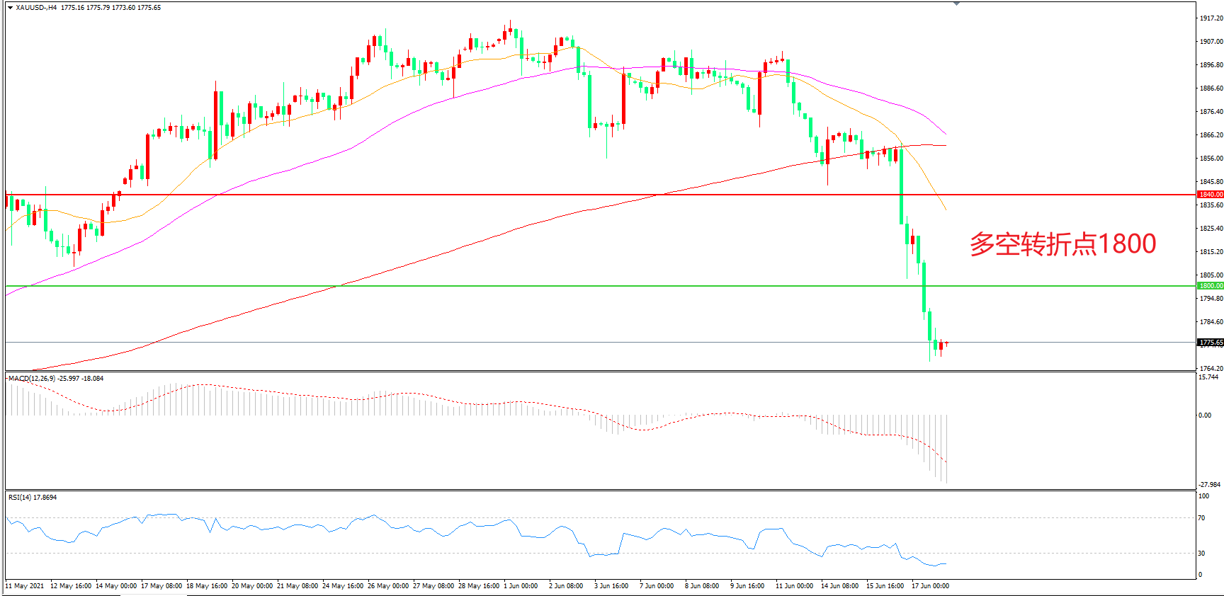 周四(6月17日),美联储主席鲍威尔在新闻发布会上首次承认,通货膨胀可能会比美联储预计的更加严重,市场普遍解读为美联储表态终于由过去的特别“鸽”转变为“鹰”气十足,美指大幅飙升,现货黄金持续暴跌,收报1774.01美元/盎司,逼近八年最大跌幅。在恐慌情绪的推动下,金价下行趋势仍未完结,切勿盲目抄底,短线仍以逢高做空为主。