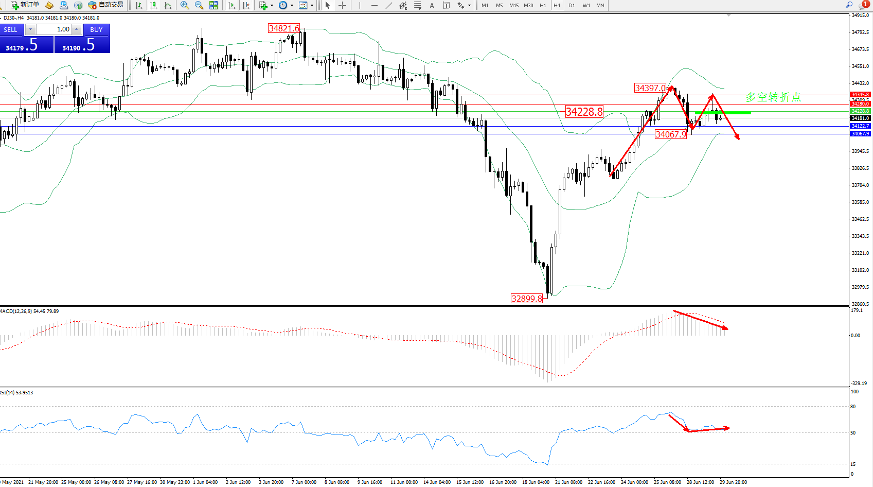 技术点评:低位多头动力持续震荡上扬,高位抵达34397位置后遇阻,开始反转下行,跌至布林带指标中轨附近节点短暂上移后再度下行,布林带指标呈收口走势中,关注中轨上側附近节点,MACD指标处于多头区域高位维持整理后有缓慢下行迹象,RSI指标处于多头区域高位震荡回撤,纠结于50均衡线上方弱势徘徊中;