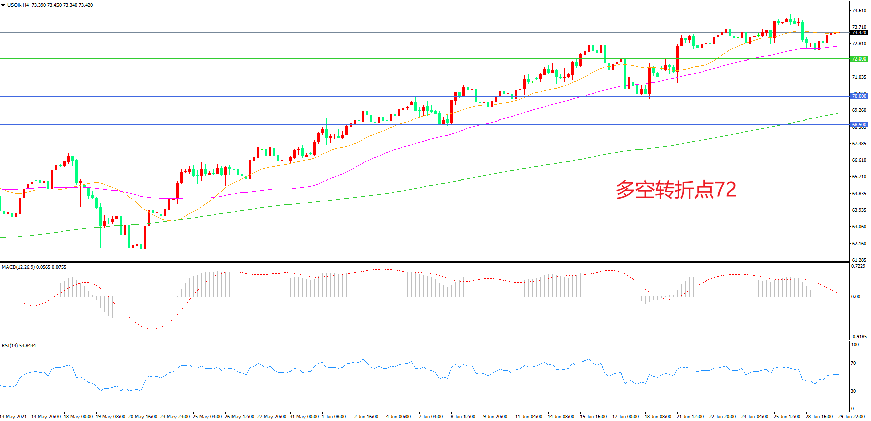 周二(6月29日),因俄罗斯与沙特之间再度出现分歧,OPEC +联合部长级监督委员会会议将从周三推迟至周四,投资者重点关注Delta病毒传播态势,美国WTI原油延续高位震荡,收报72.73美元/桶。今日凌晨公布的数据显示,当周API原油库存骤降820万桶,远超预期的446万桶,对油价有所提振,如果晚间EIA与此表现一致,油价有望迎来新的上涨。