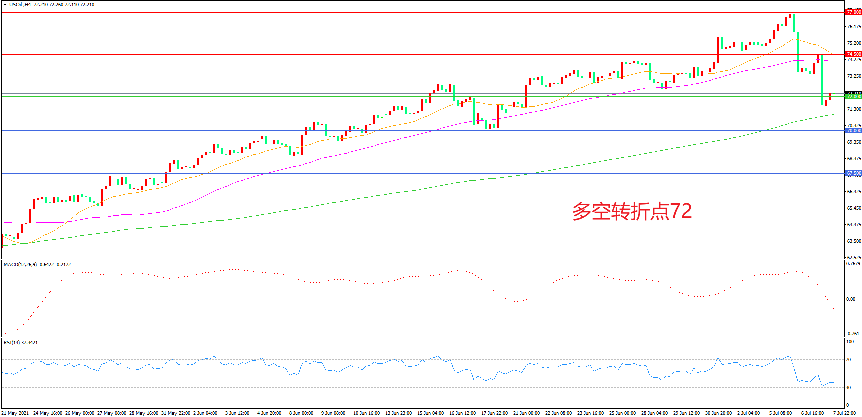 周三(7月7日),美国能源信息署(EIA)在官网上发布了7月短期能源展望报告。报告预计美国2021年的原油产量将出现下降,但由于OPEC+内部难以调和的分歧让多头表现谨慎,美国WTI原油再度大跌,收报72.24美元/桶。市场情绪在一夜之间仿佛发生了巨大的变化,八月份没有增产成为短暂的事实,但谁也不知道OPEC之间的内部矛盾是否会引发更大的利空因素。