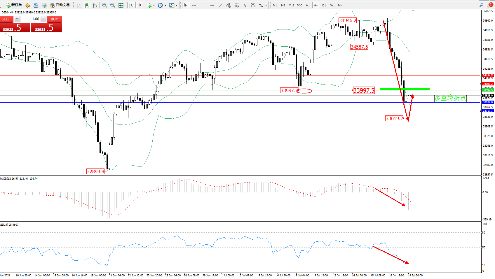 技术点评:空头动力延续布林带指标下轨附近强势下探,低位抵达33619位置后开始短暂震荡回升,但下行趋势态势良好,短期回升并未改变趋势,布林带指标呈张口走势持续中,MACD指标处于空头区域持续震荡下行,RSI指标处于空头区域维持震荡向下移动后低位开始有走平迹象;