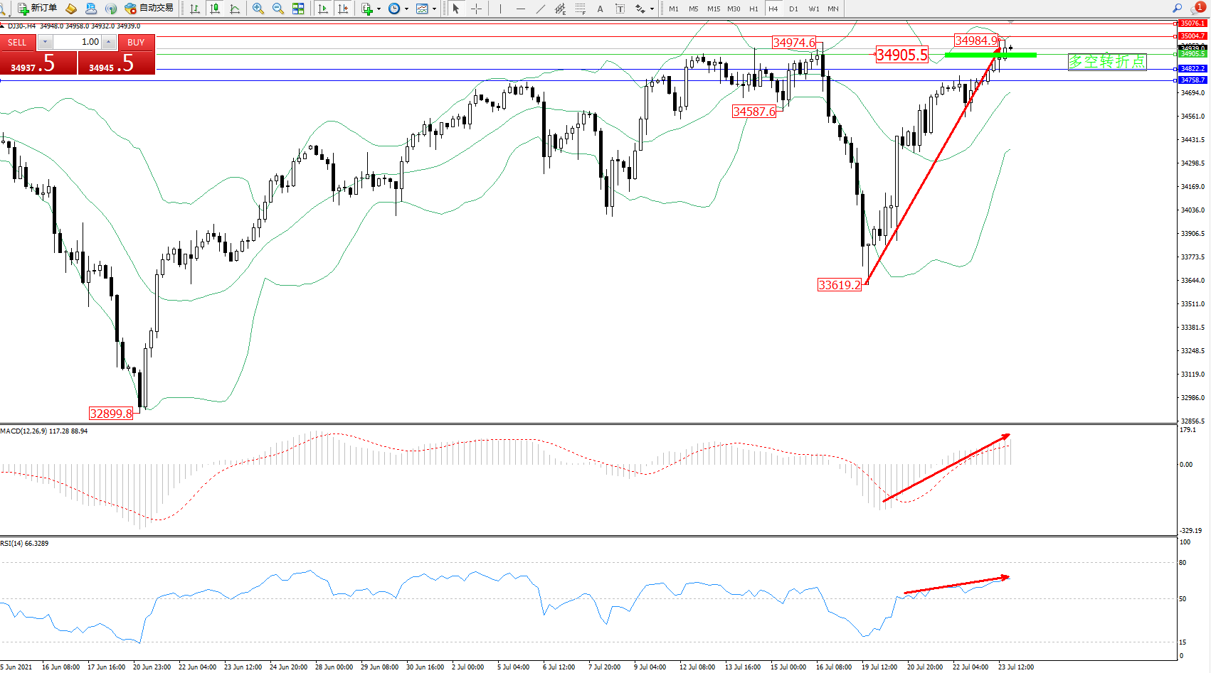 技术点评:低位多头动力持续震荡上扬,高位触及布林带指标上轨附近节点34984位置后开始整理,前期高位34975位置已然破位,布林带指标呈收口走势中,MACD指标处于0轴线上方多头区域持续徘徊上移,RSI指标处于多头区域不断上移;