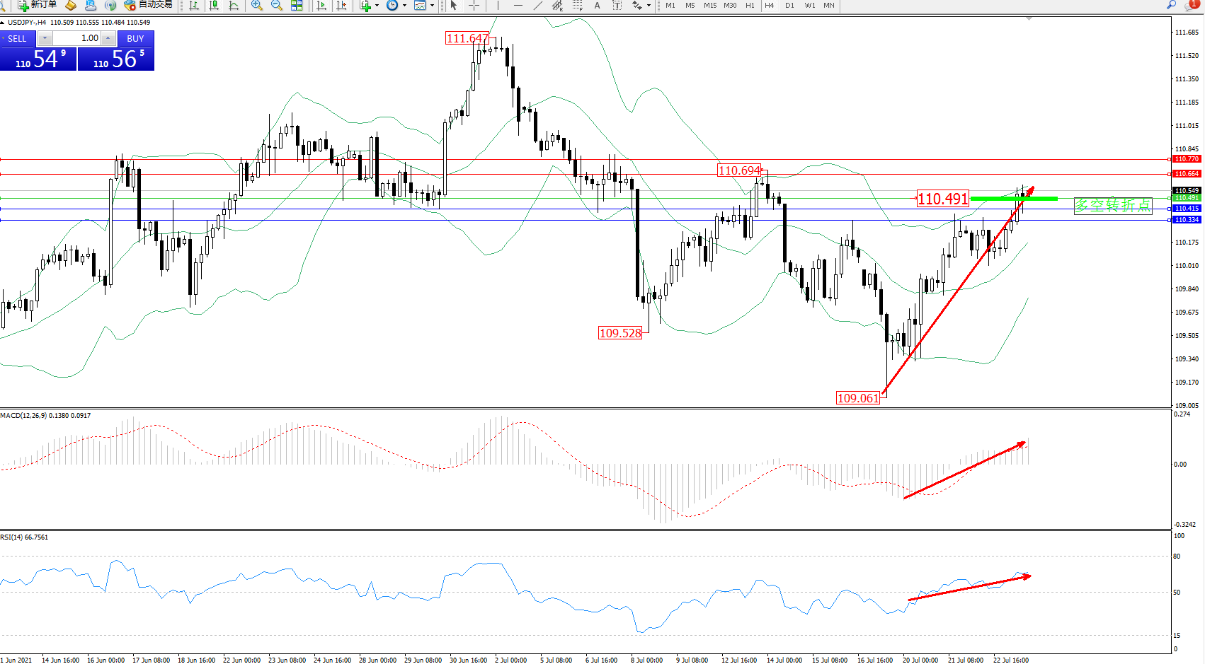 技术点评:低位多头动力强势震荡上扬,高位触及布林带指标上轨附近节点后有继续拉升态势,前期高位110.694位置近在咫尺,破位在即,布林带指标呈收口走势持续向上移动中,MACD指标处于多头区域持续震荡向上移动中,RSI指标处于多头区域持续徘徊上移;