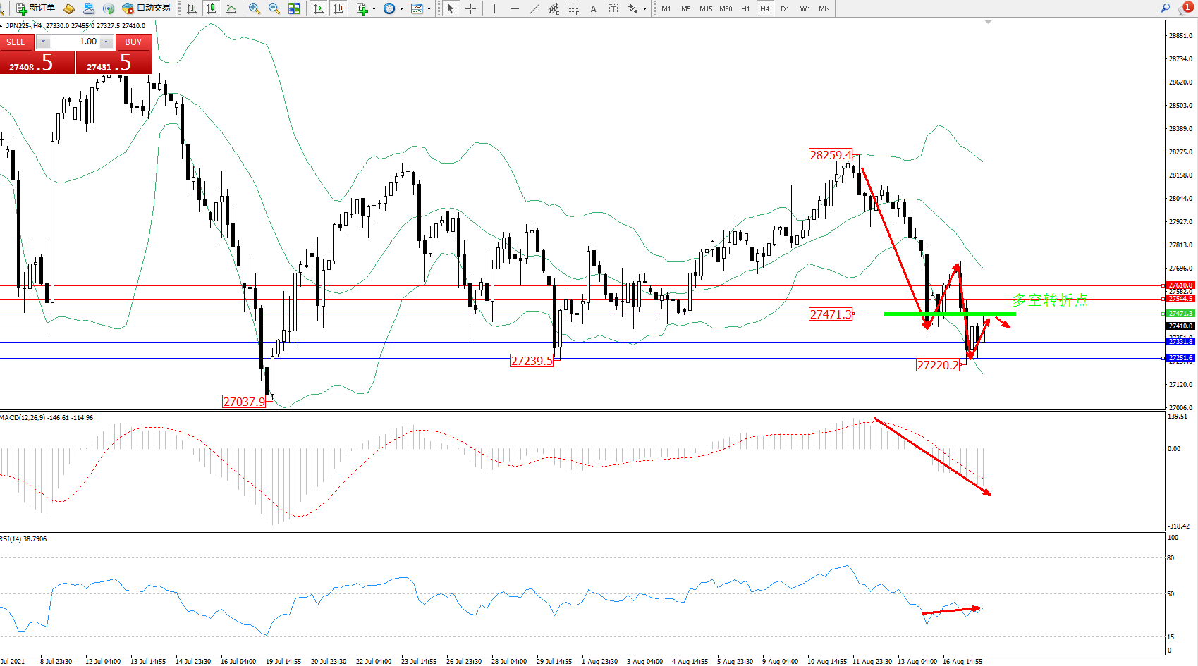 技术点评:空头动力延续布林带指标通道中下轨区间持续震荡下行,低位抵达27220位置后开始短暂回升,布林带指标呈空头向下移动走势持续中,且处于收口状态,MACD指标处于空头区域不断下移中,RSI指标处于50均衡线下方空头区域持续震荡平移;