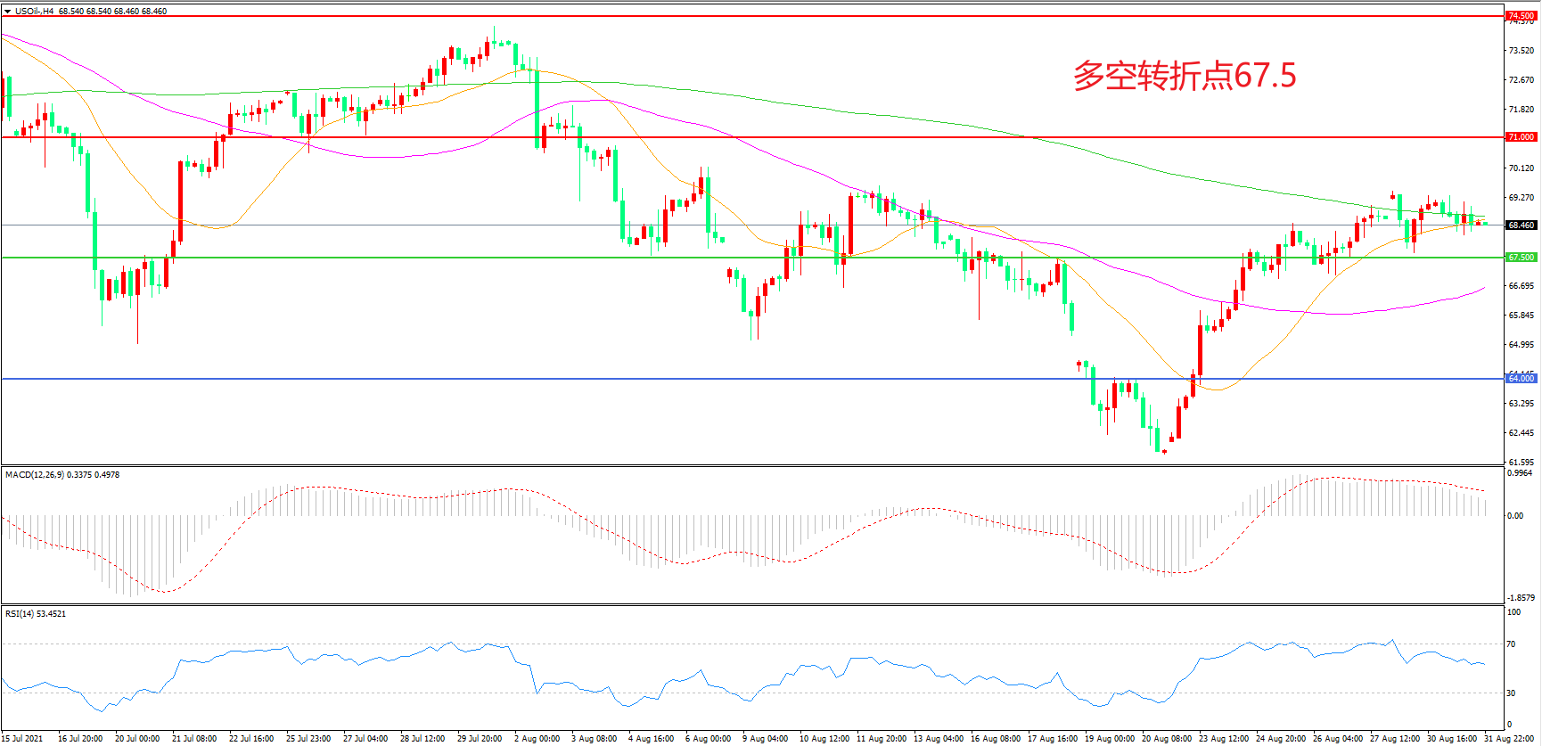 周二(8月31日),飓风影响仍在持续,目前供给端的恢复速度似乎比较快,大概需要1周的时间,但是炼厂的全面恢复则需要两到四周,供需失衡叠加OPEC大会即将召开,多空双方表现都相对谨慎,WTI原油延续高位震荡,收报68.47美元/桶。周三(9月1日)凌晨公布的API原油库存数据大幅减少404万桶,如果晚间EIA数据表现与此一致,有望助推油价突破关键阻力。