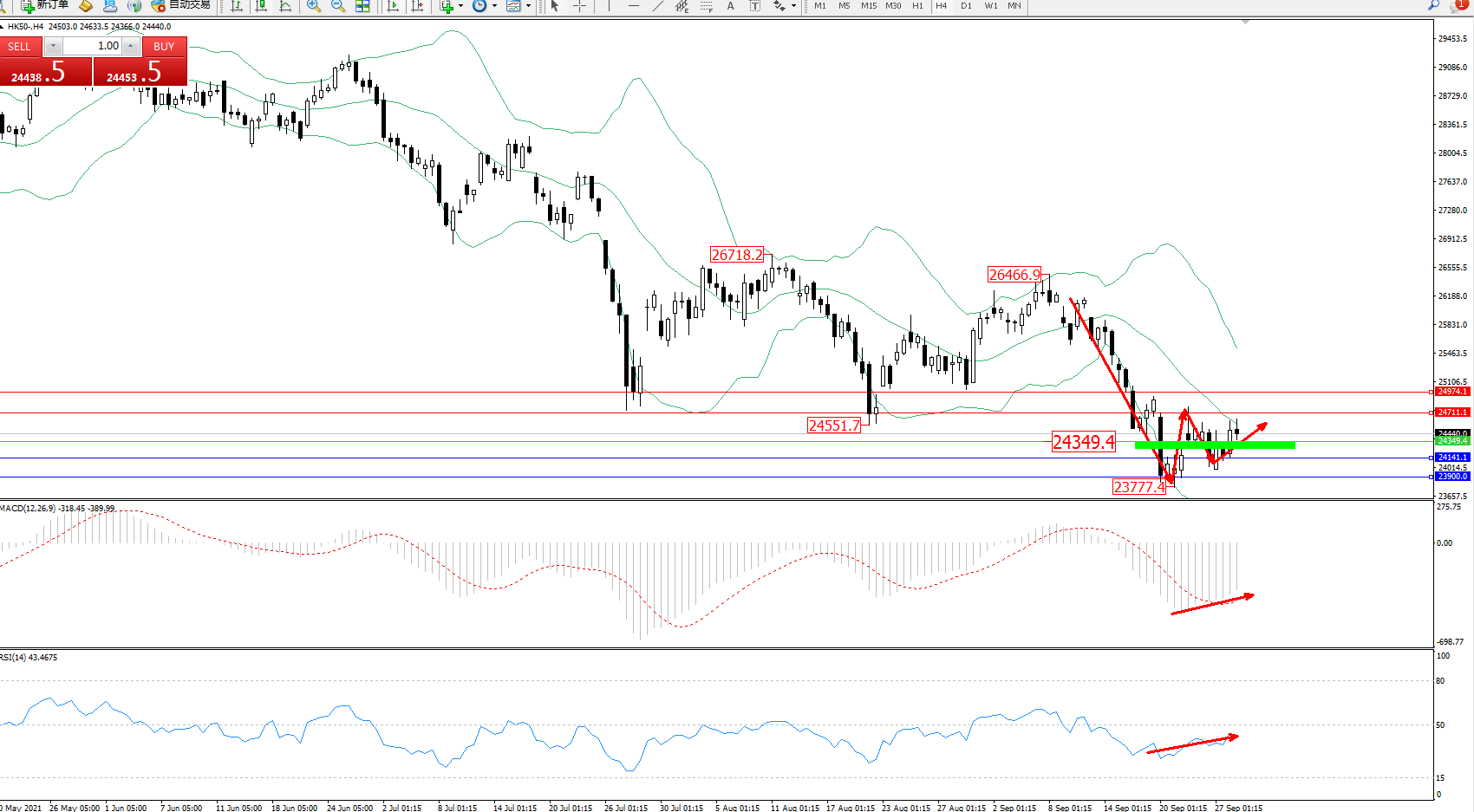 技术点评:空头动力延续布林带指标通道下轨附近持续震荡下行,低位抵达23777位置后得到支撑开始维持窄幅整理,多头动力开始有缓慢伺机入场态势,短期触及布林带指标中轨附近节点后有继续试探上移迹象,布林带指标呈收口走势中,MACD指标处于空头区域低位整理缓慢上移,RSI指标处于空头区域维持平缓向上移动;
