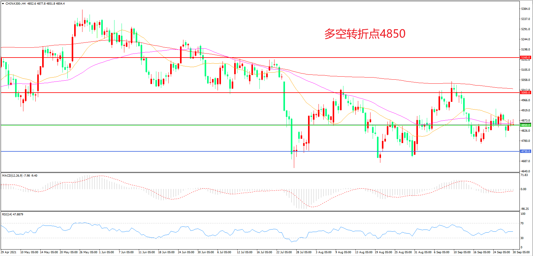4小时图看,沪深300延续低位震荡,整体受制于55周期,均线系统逐渐走平,MACD绿柱增加,RSI指标走平,日内延续震荡概率较大。