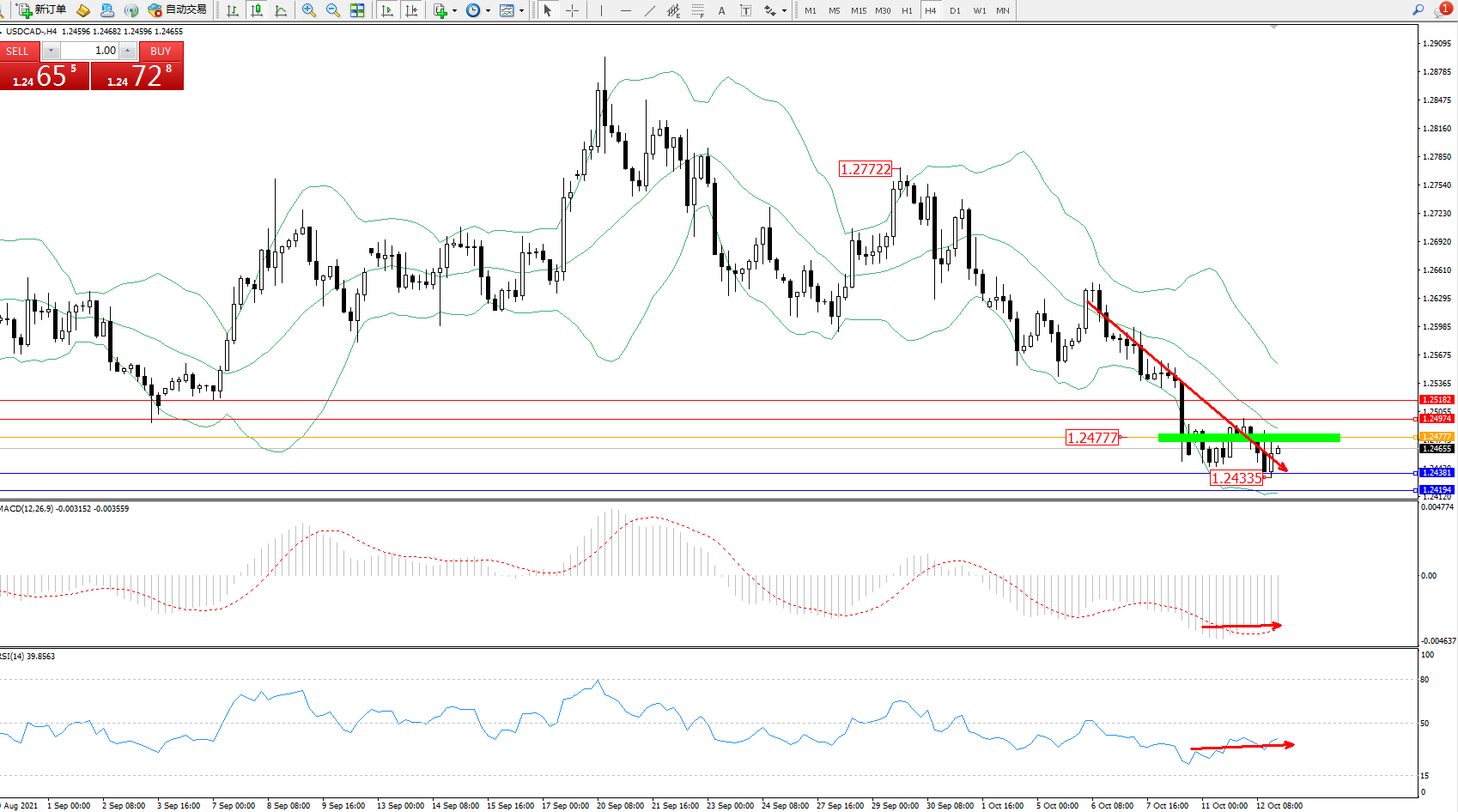 技术点评:空头动力延续布林带指标通道中下轨区间持续震荡下行,低位抵达1.24335位置后得到短暂支撑整理,但下行趋势态势良好,短期依旧有进一步向下移动态势,布林带指标呈下行趋势走势不断下行中,MACD指标处于空头区域低位维持整理平移,RSI指标处于50均衡线下方空头区域持续整理中;