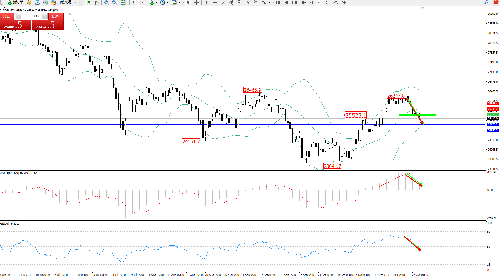 香港恒生指数10月28日(周四)收盘下跌73.01点,跌幅0.28%,报25555.73点;港股早盘冲高,午后震荡走弱。恒生科技指数涨0.06%报6445点。受政策影响,电力股继续走高,家电股、乳制品股、影视娱乐股、电信股普涨,澳优升近7%表现较佳;大型科技股涨跌各异,美团涨超1%,阿里巴巴、网易小幅上涨,快手跌超1%,小米跌0.23%。恒大概念股、煤炭概念股大跌,钢铁、稀土、铝、铜等有色金属板块齐挫。今日大市成交额为1293亿港元,南下资金净流入4.63亿港元。