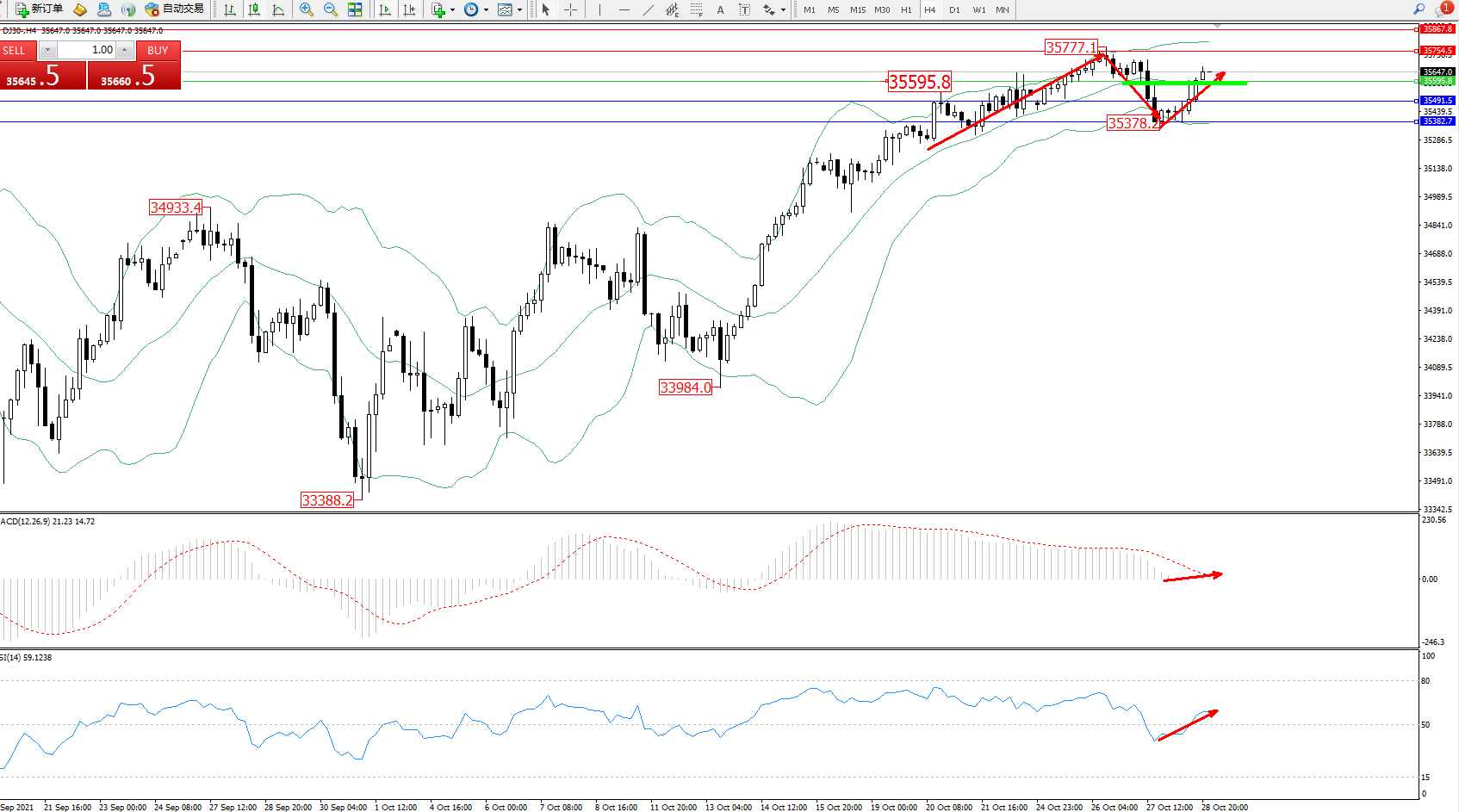 技术点评:多头动力延续布林带指标通道中上轨区间持续震荡上扬,高位抵达35777位置遇阻回撤,抵达35378位置后开始反转上移,突破布林带指标中轨进入中上轨迹不断上移中,布林带指标呈缓慢张口走势中,MACD指标处于0轴线附近弱势徘徊,RSI指标多头动力突破50均衡线进入多头区域持续上移;