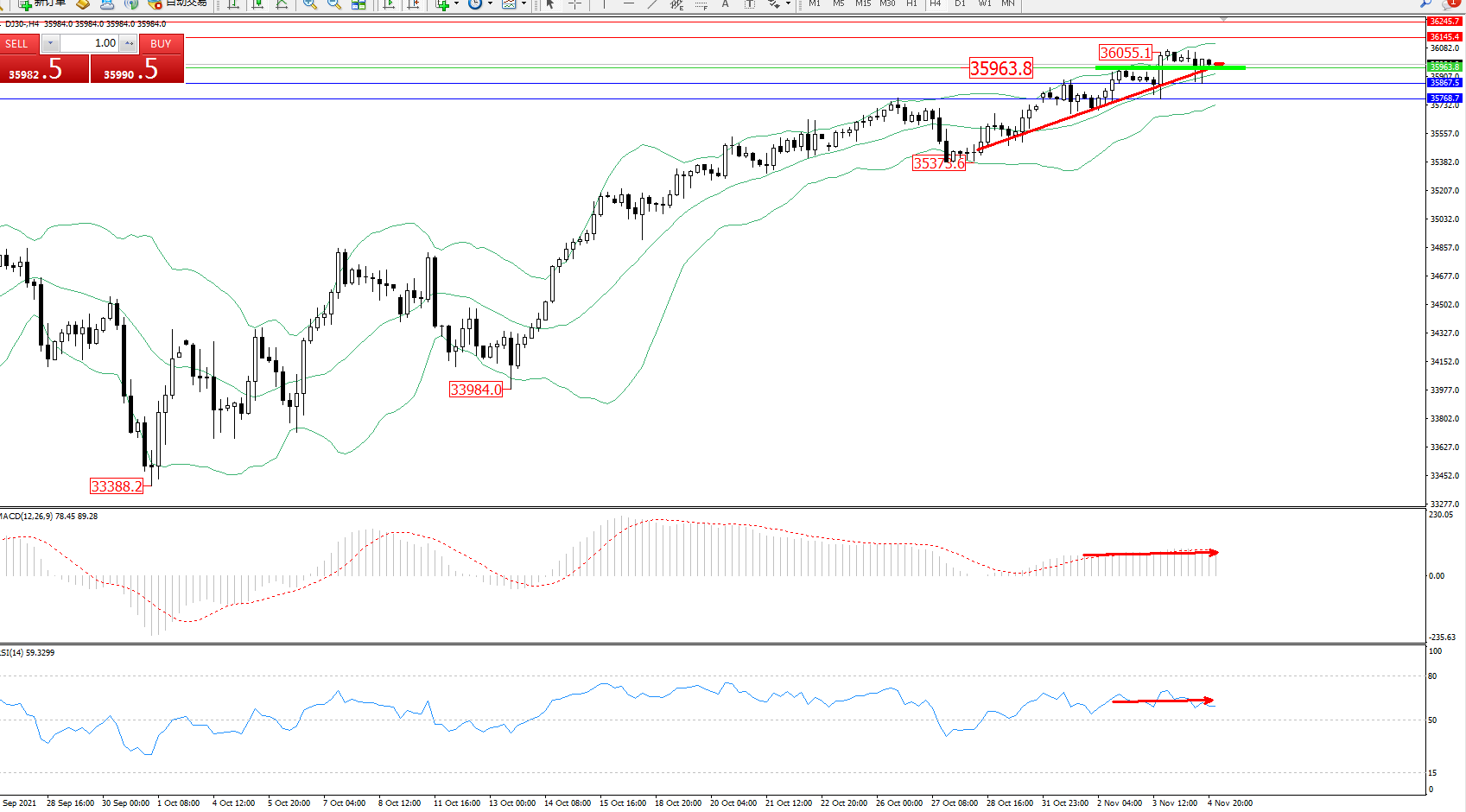道琼斯指数11月4日(周四)收盘下跌32.72点,跌幅0.09%,报36124.86点;美股走势分化,道指初步收跌 ,在美联储利率会议后,一些投资者仍然认为,持续的通胀可能会迫使官员在2022年多次加息。与此同时,一些交易商继续押注通胀居高不下,突显出部分债券市场和美联储之间的预期存在分歧。美联储主席鲍威尔在新闻发布会上向投资者保证,美联储不会过于激进地加息,尽管美联储计划在6月前结束债券购买,但美股随后攀升至新高。鲍威尔表示,美联储认为,随着企业增加商品生产,供应链紧张局面缓解,通货膨胀将在明年第二季度或第三季度下降。