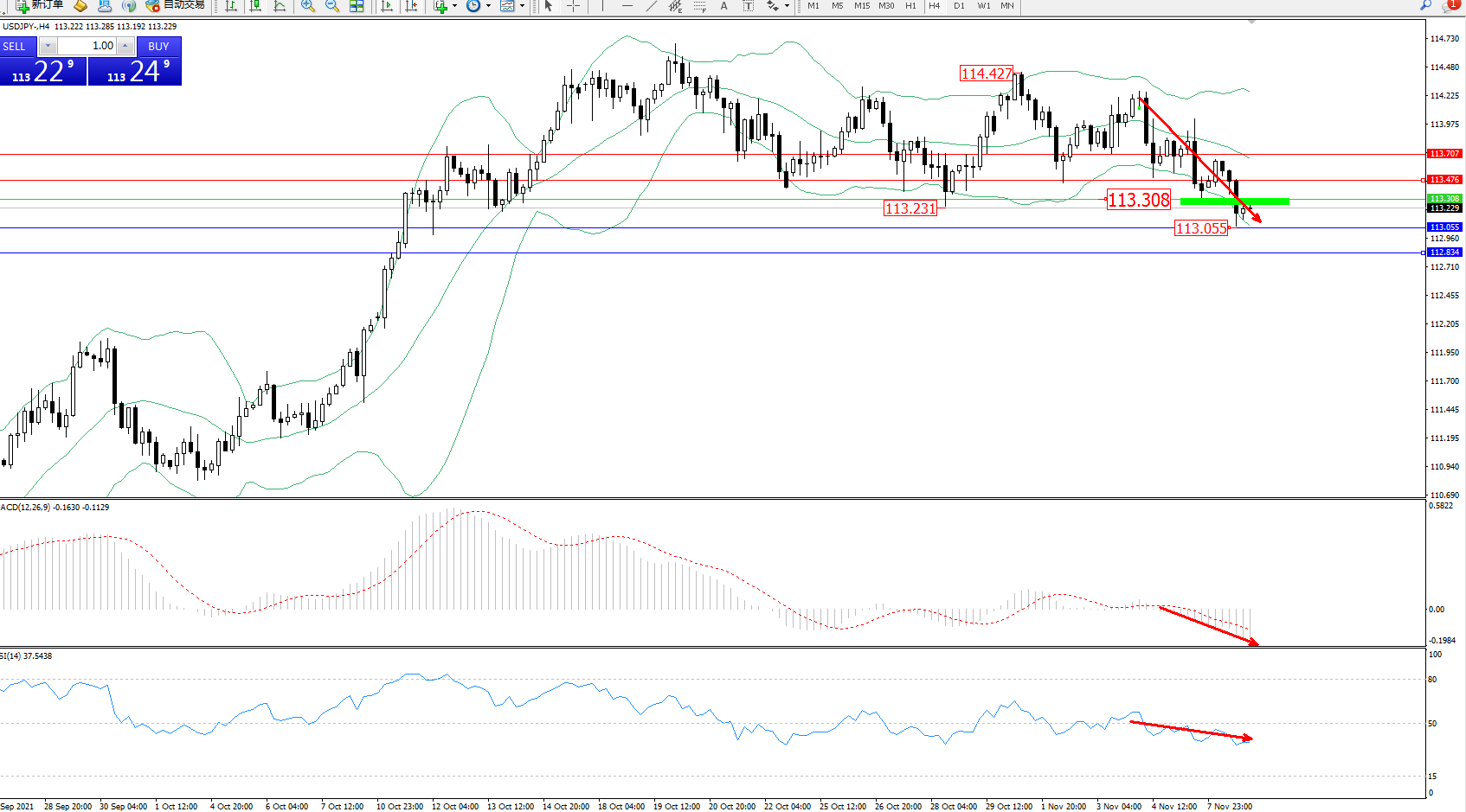 技术点评:空头动力延续布林带指标通道中下轨区间持续震荡下行,低位抵达113.055位置后短暂整理,空头动力有继续向下移动态势,布林带指标呈缓慢张口走势持续中,MACD指标处于0轴线下方空头区域维持整理平缓下行,RSI指标处于50均衡线下方空头区域维持整理徘徊;