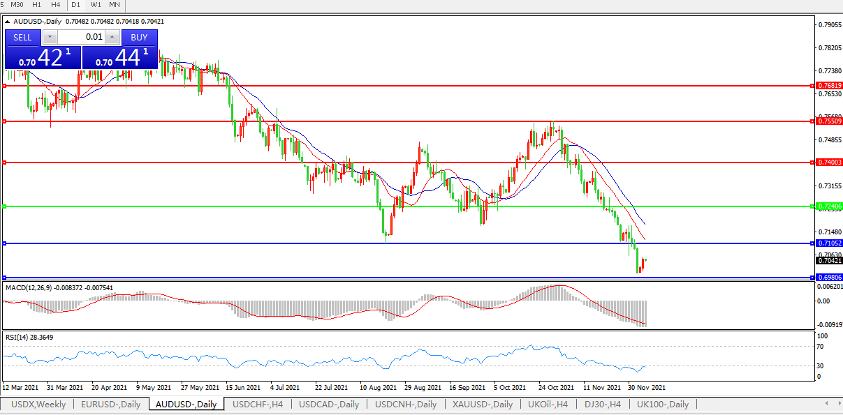 技术面简析:日图均线呈有序空头排列,汇价止跌后小幅反弹,MACD运行于0轴下且量能持续放量,RSI小幅反弹,预计汇价大概率将在反弹后进一步下行。