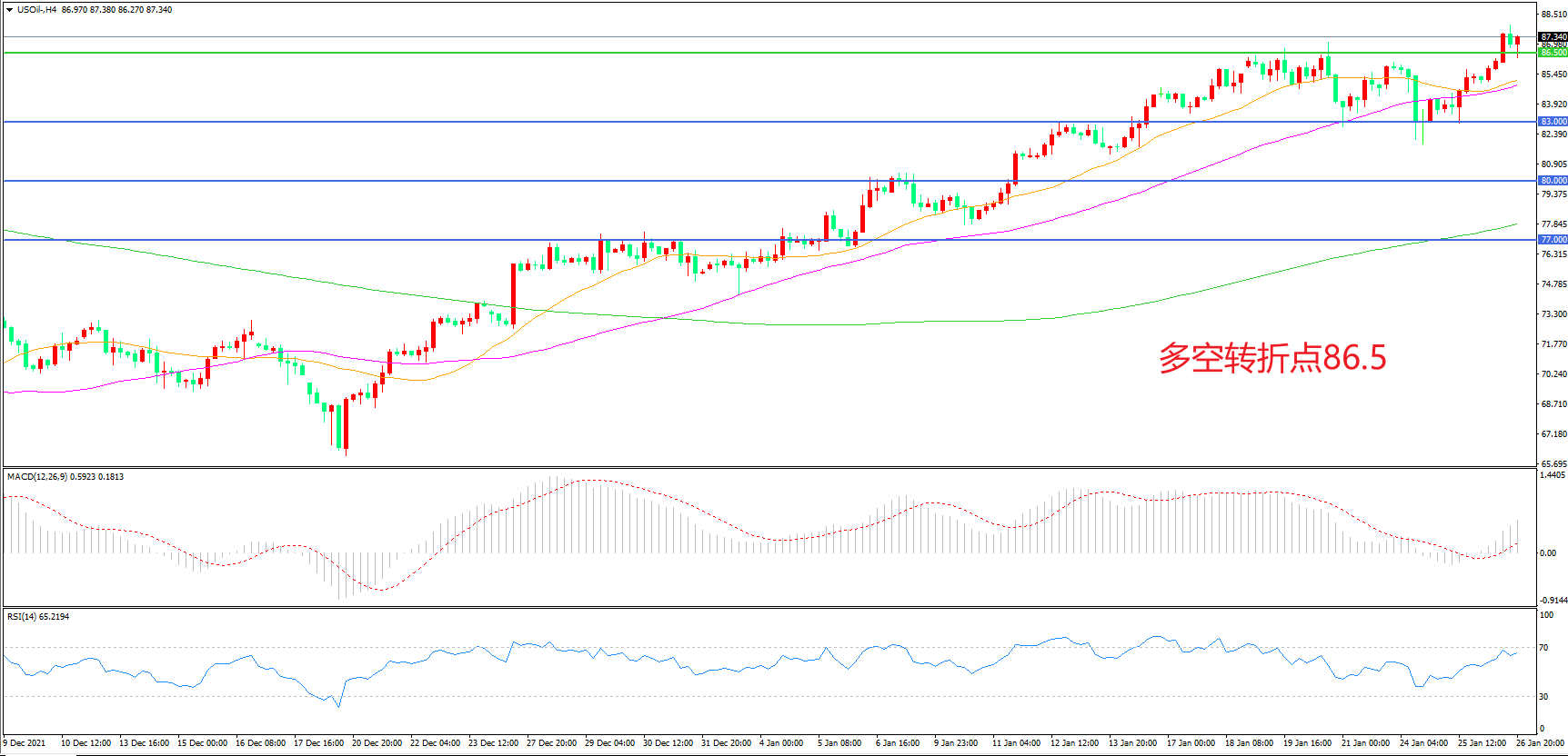 周三(1月26日),美联储释放了今年3月的下次会议就可能决定开始加息的强烈信号,但地缘政治的影响掩盖了加息的不利影响,美国WTI原油延续强势表现,收报87.30美元/桶。短线来看,在地缘政治的强力推动之下,对供应的担忧盖过了利空因素影响,在原油市场出现持续的超预期供应或者累库动作之前,油价保持上行的概率较大。