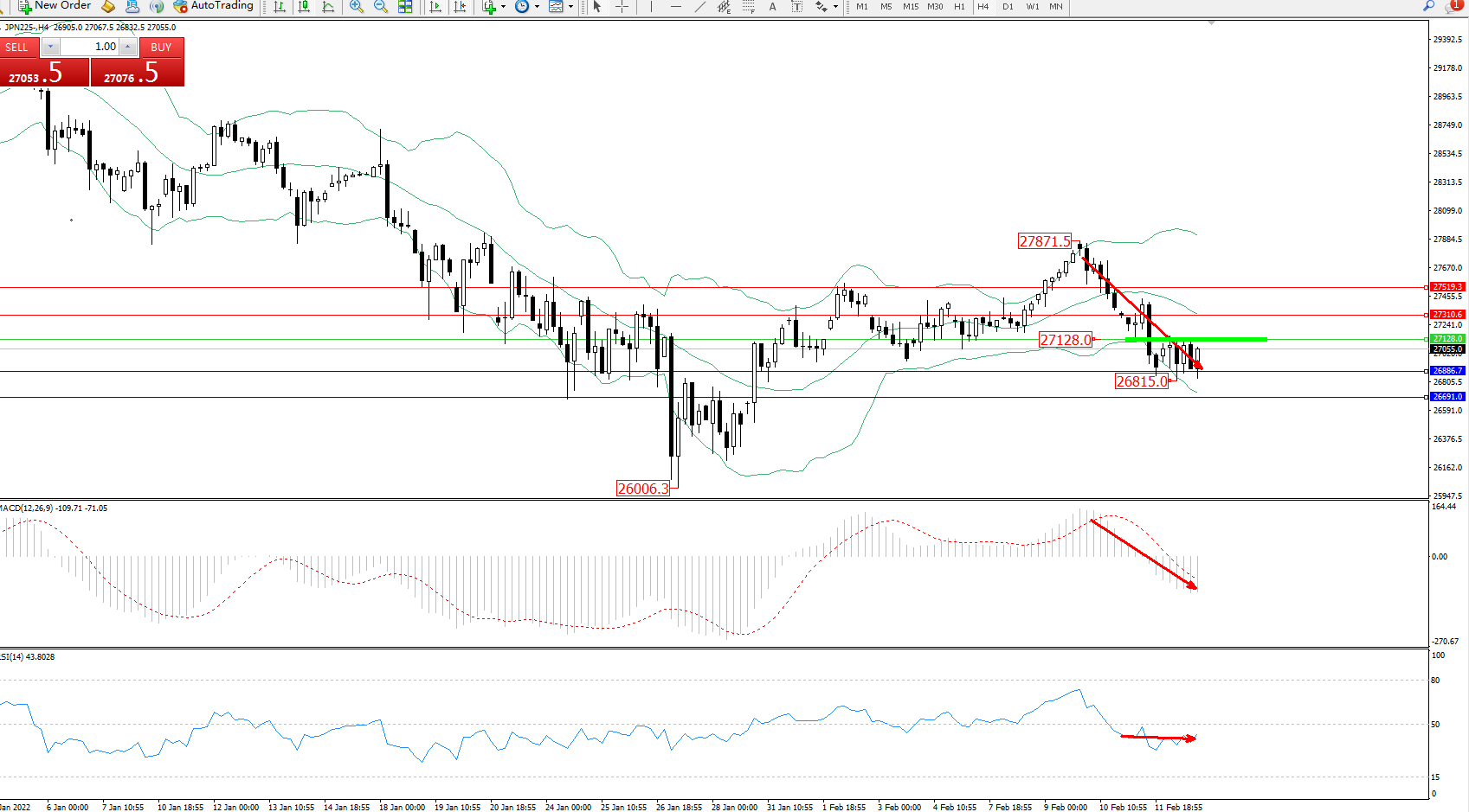 日经225指数2月14日(周一)收盘下跌627.58点,跌幅2.27%,报27068.50点。日本股市日经指数周一大跌,在科技股拖累下创近三周来最大跌幅,投资者对乌克兰紧张局势不断升级以及通胀风险扩大感到担忧。大和证券的高级策略师Shuji Hosoi说,“由于上周五(日本)休市,今天市场受到上周发生的两个独立的负面消息的冲击--围绕乌克兰和俄罗斯的紧张局势,以及美国消费者物价大幅上升。如果乌克兰局势恶化,市场可能会进一步下跌。”日股权重股下跌,优衣库(Uniqlo)运营商迅销(Fast Retailing) 9983.T下跌3.09%。软银集团下跌3.92%,空调制造商大金工业跌4.1%。