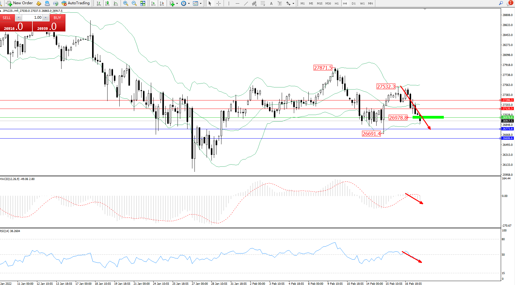 技术点评:高位空头动力急速震荡下挫,触及布林带指标下轨附近节点后有继续下行态势,布林带指标呈收口走势持续平移中,前期低位26691位置近在咫尺破位在即,MACD指标处于0轴线下方不断下行中,RSI真不错护眼50均衡线下侧弱势下探;