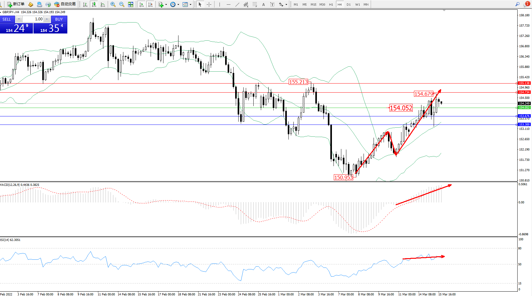 技术点评:多头动力延续布林带指标通道中上轨区间持续震荡上扬,高位抵达154.679位置节点后开始整理短期多头拉升态势良好,且未见最终止步迹象,布林带指标呈缓慢张口走势不断向上移动中,MACD指标处于多头区域维持震荡上移,RSI指标处于多头区域维持整理平移中;