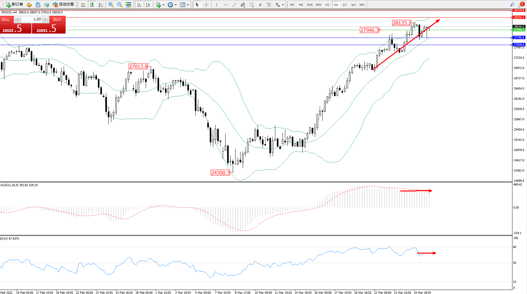 技术点评:多头动力延续布林带指标通道中上轨区间持续震荡上扬,高位抵达28125附近节点开始震荡,短期多头上扬态势良好,布林带指标呈上行趋势走势持续中,MACD指标处于多头区域维持整理平移,RSI指标处于多头区域维持整理中;