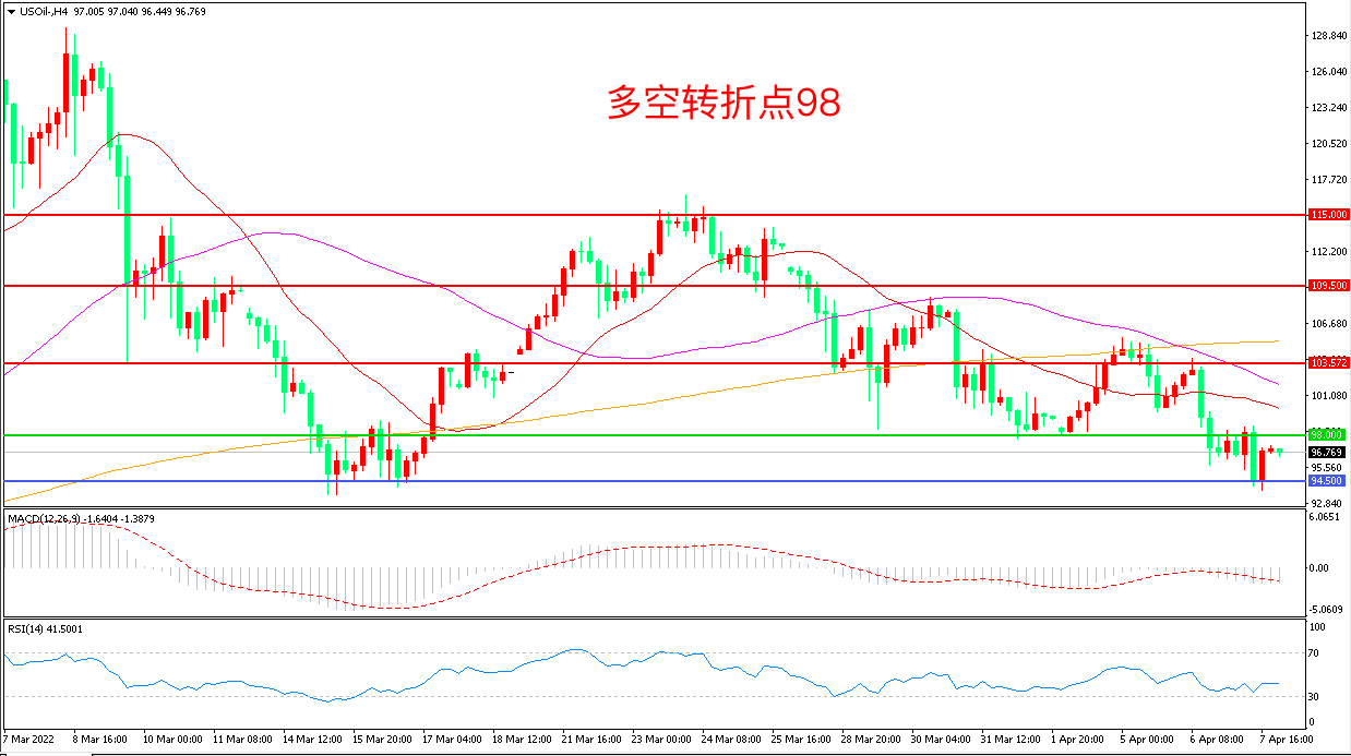 周四(4月7日),国际能源署(IEA)署长比罗尔表示,将协调成员国释放1.2亿桶石油。这是IEA 47年历史上最大的油储释放量,美国WTI原油小幅回落,收报96.97美元/桶。但高盛等投行普遍认为抛储计划无法解决石油市场的“结构性短缺”, 俄罗斯4月份原油产量或将比前月减少约50万桶/日,油价或将面临关键考验。