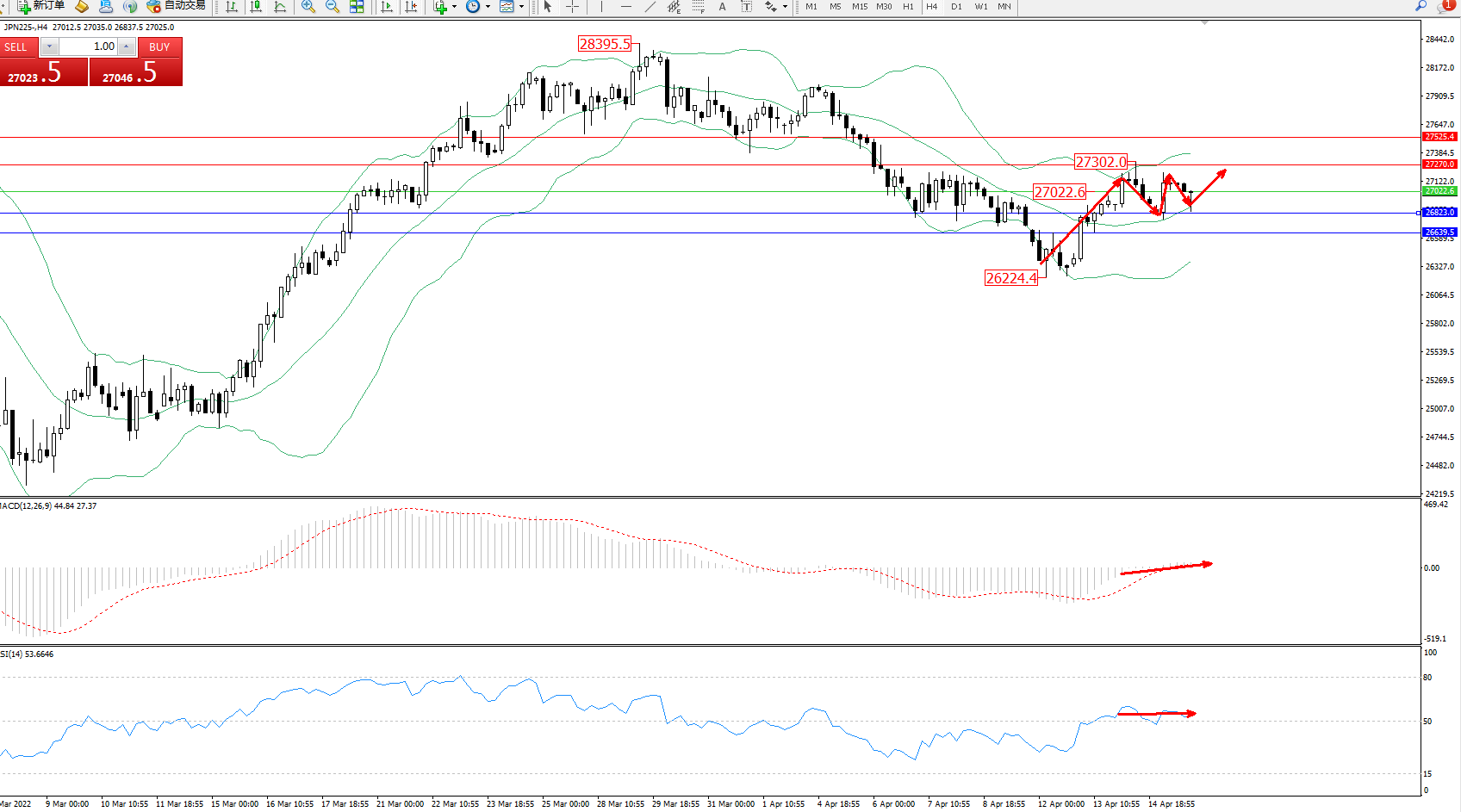 技术点评:低位多头动力延续布林带指标通道中上轨区间持续震荡上扬,高位抵达27302位置节点后开始震荡,短期多头动力有继续震荡向上移动态势,布林带指标呈逐渐张口走势缓慢上移,MACD指标处于0轴线附近弱势徘徊中,RSI指标处于50均衡线附近窄幅整理平移;