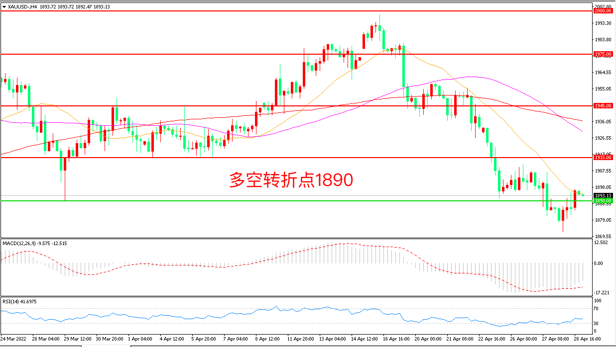 周四(4月28日),美国一季度GDP年化季环比意外萎缩1.4%,为2020年中旬以来首次转负,美元指数短线下挫近30点,现货黄金自低位拉升近10美元,收报1993美元/盎司。目前黄金的主线在于美联储加息速度和幅度,以及通胀的发展,5月金价有望迎来一轮反弹行情,不过预期高度相对有限,美联储未来的进一步缩表仍是多头“拦路虎”。