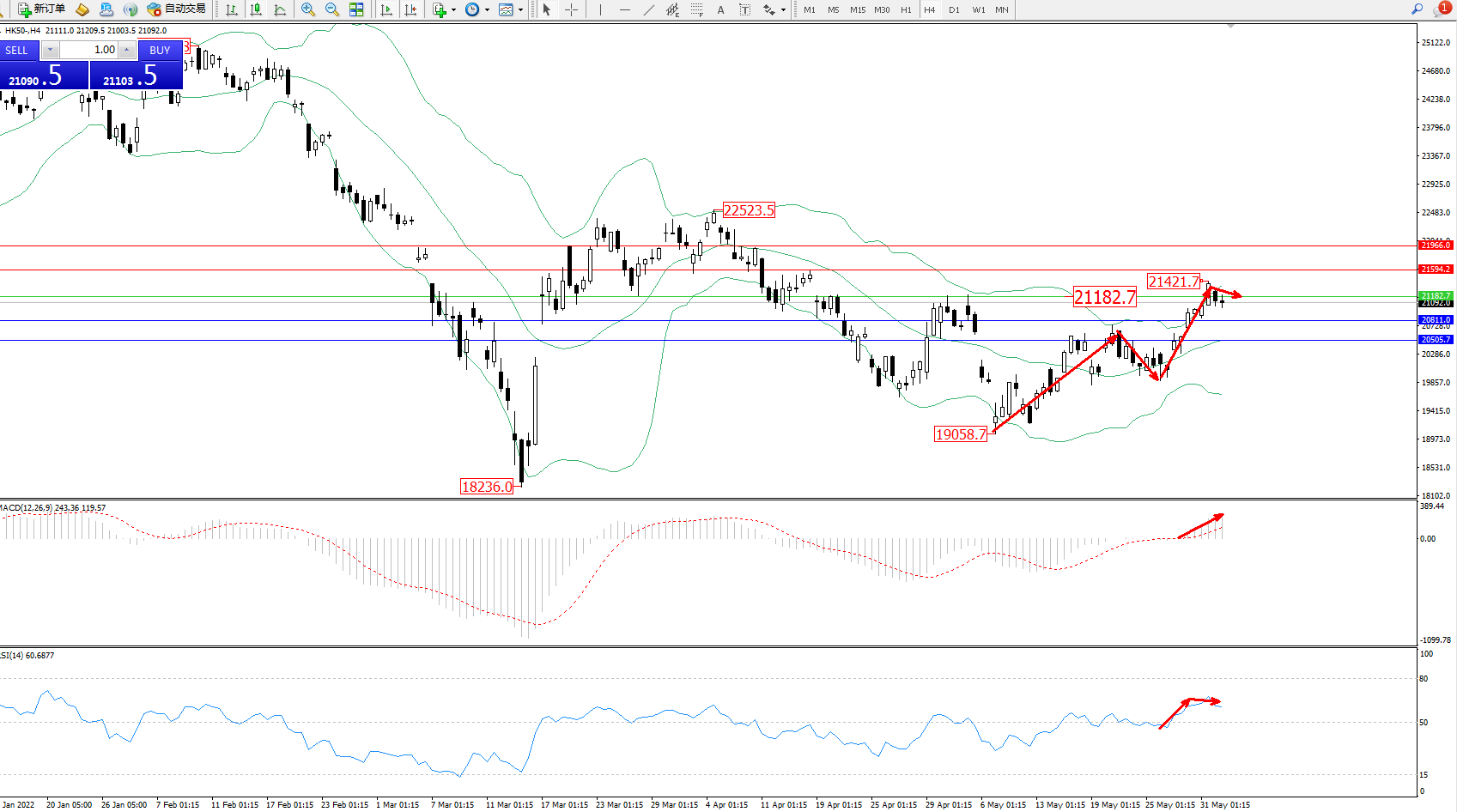 技术点评:多头动力延续布林带指标通道中上轨区间持续震荡上扬,高位抵达21421附近节点后整理,短期多头拉升走势维持高位徘徊,布林带指标呈收口走势持续,MACD指标处于0轴线上方徘徊,RSI指标处于50均衡线上側多头区域维持整理中;