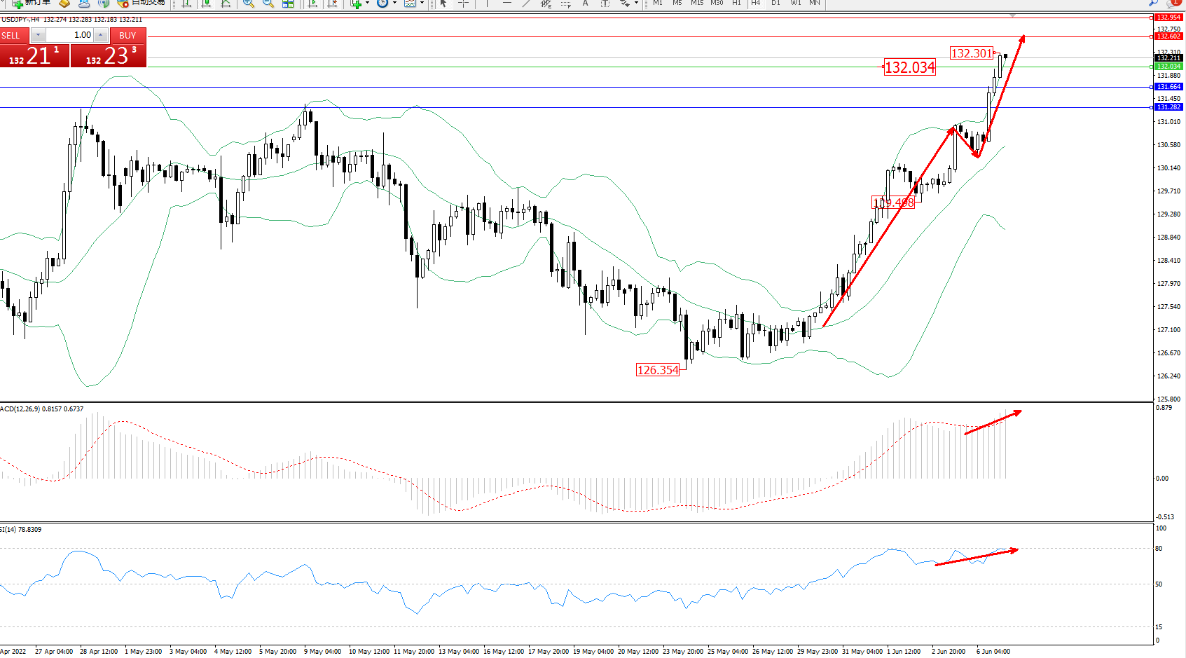 技术点评:多头动力延续布林带指标上轨附近持续拉升,高位抵达132.301附近震荡,布林带指标呈多头动力持续拉升后开始张口,短期多头上扬走势或将持续,MACD指标处于多头区域维持整理高位上移,RSI指标处于多头区域维持80均衡线下侧徘徊;