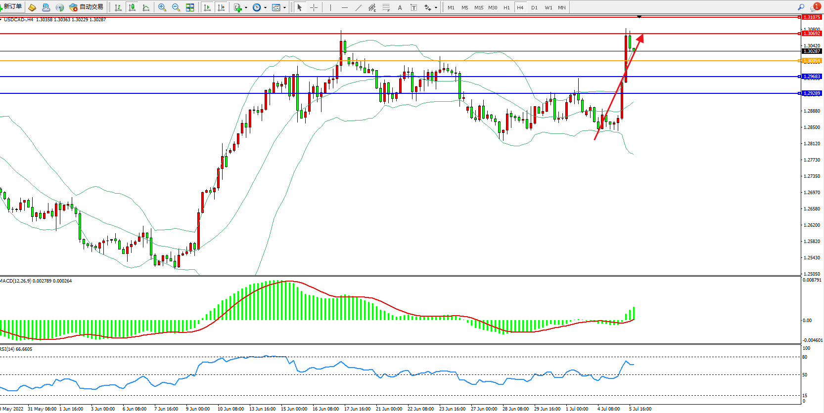 美元加元USDCAD——4小时K线图显示: