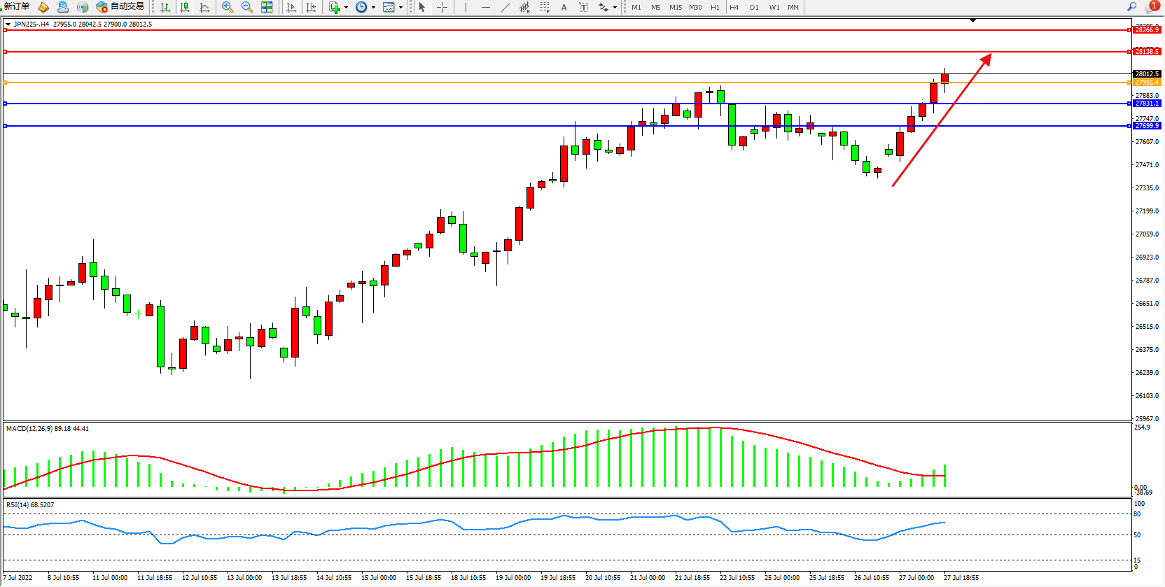 日经225指数7月27日(周三)收盘上涨90.62点,涨幅0.33%,报27722.50点。日本5月领先指标终值 101.2,前值101.4。日本经济产业省METI:从周四开始,日本将支付每升39日元的汽油补贴。