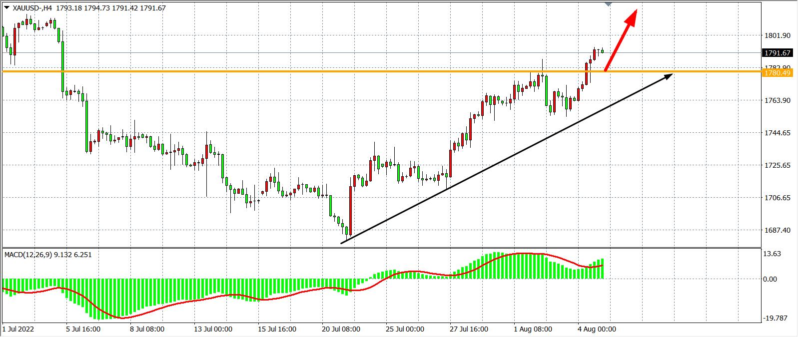 周四(8月4日) 上周美国初请失业金人数上升到26万人,接近一年以来最高水平,表明劳动力市场继续放缓,同时美联储官员透露降息线索,认为9月份加息50个基点的可能性较大,美元指数加速下行,10年期美债收益率跌破2.7%关口,现货黄金突破1790美元/盎司,续刷7月5日以来新高,收涨1.47%。今日非农就业数据将成为市场焦点,若该数据走好,需谨防黄金高位受阻。