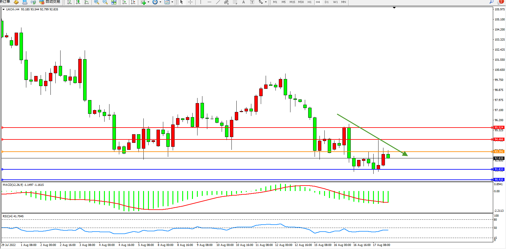 4小时图看:市场空头情绪笼罩,持续向下移动后窄幅整理,短期跌势或将延续,MACD指标处于空头区域维持整理平移,RSI指标处于50均衡线下侧弱势徘徊;