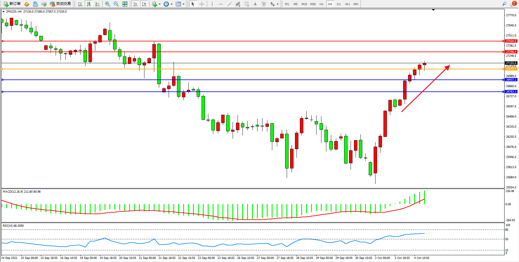 日经225指数10月4日(周二)收盘上涨786.07点,涨幅3.00%,报26990.50点。日本东京地区9月核心消费者物价指数(CPI)同比上涨2.8%,创2014年以来最大涨幅,表明成本压力正在扩大。